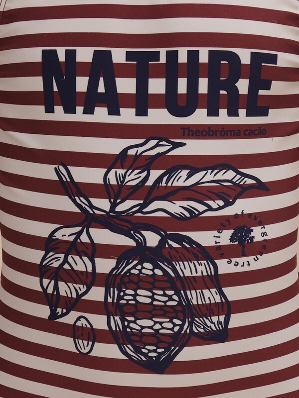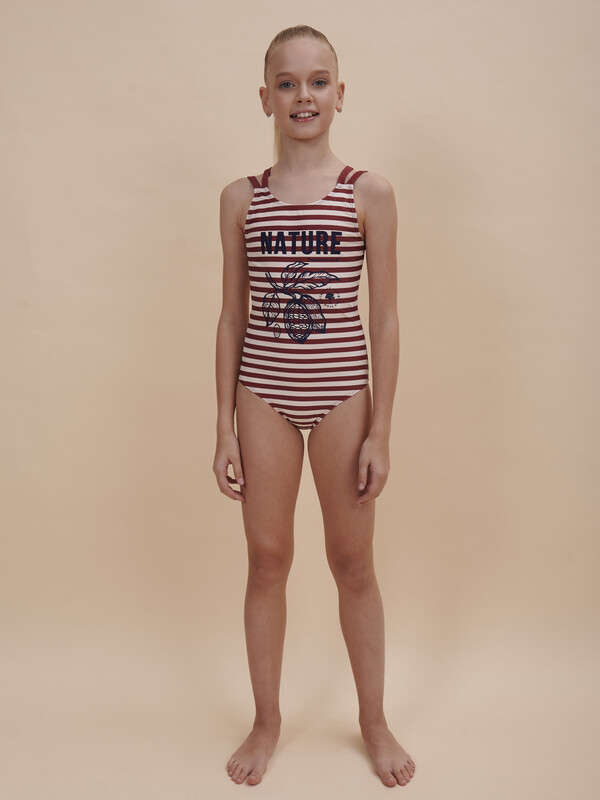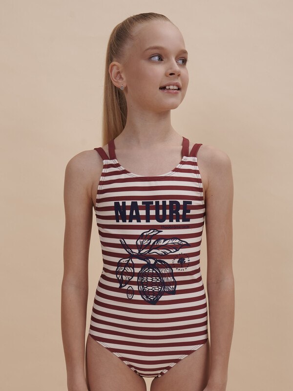 Модный слитный купальник в для девочки. Модель с двумя парами лямок: одни идут прямо, вторые перекрещиваются на спинке. Бретели мягкие. не сползают, исключают трение и раздражение. Передняя часть изделия с подкладкой — не просвечивает. Детский купальник выполнен из полиамида и эластана — он прекрасно тянется, не теряя при этом своей формы, не выгорает и быстро сохнет. По переду модель декорирована красивым принтом в ботаническом стиле. На принте изображены какао-бобы. Надпись переводится:"природа". Принт мягкий и стойкий, не боится частых стирок. Купальник в бордовую горизонтальную полоску — такой узор в стиле тельняшки — один из самых трендовых в этом сезоне. В линейке есть детские купальники следующих размеров: 3 (98); 4-5 (104-110); 6-7 (116-122); 8-9 (128-134); 10-11 (140-146). Купальник красивый подходит для девочек дошкольного, младшего школьного возраста и девочек-подростков. Отличный вариант для летнего отдыха, пляжа, моря и бассейна. Модный купальник — чудесный подарок дочери, внучке или сестре на любой праздник. Выбирайте нужный размер по таблице размеров на фото. Цвет товара на экране вашего устройства может отличаться от цвета изделия вживую. Товар возврату и обмену не подлежит.