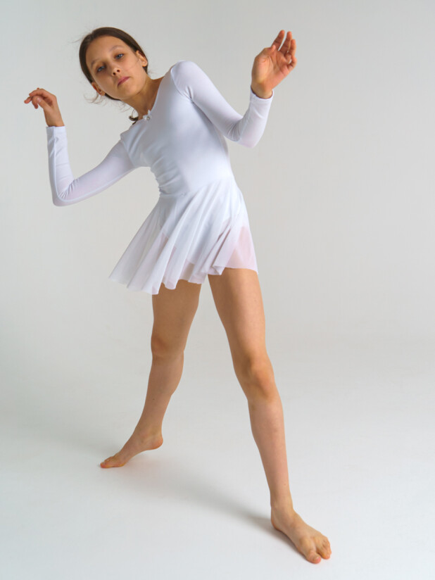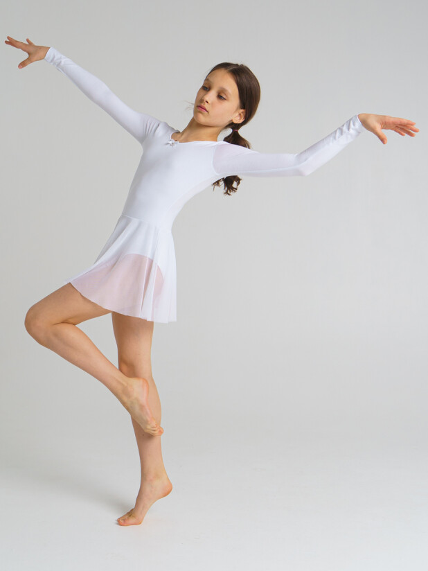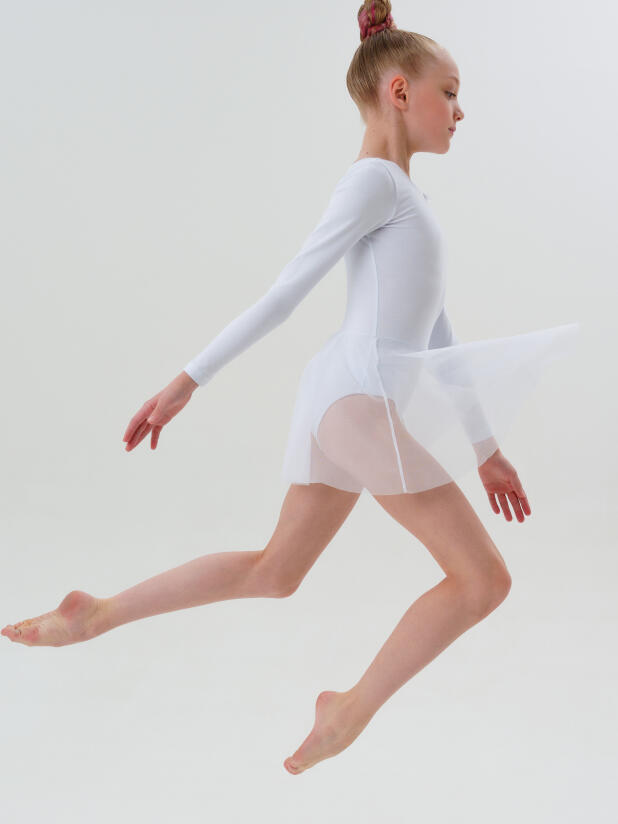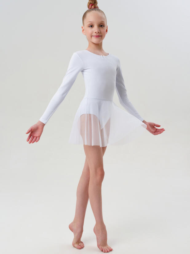Гимнастический купальник с юбкой подходит для тренировок, занятий художественной гимнастикой, танцами, хореографией, а также для выступлений и показательных номеров. Модель с длинным рукавом обеспечивает дополнительный комфорт в прохладных залах и создаёт красивую линию рук.