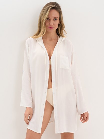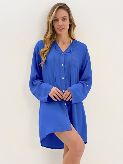 Оптовая продажа. Туника женская из тонкого и нежного вискозного полотна, укороченная, однотонная, с застежкой на пуговках, капюшоном на кулиске, длинными регулируемыми рукавами, накладным карманом на груди.