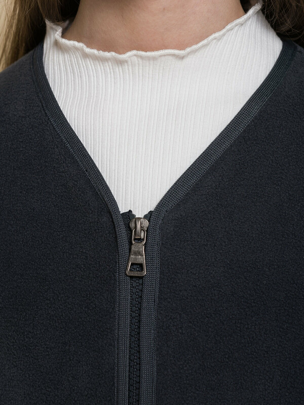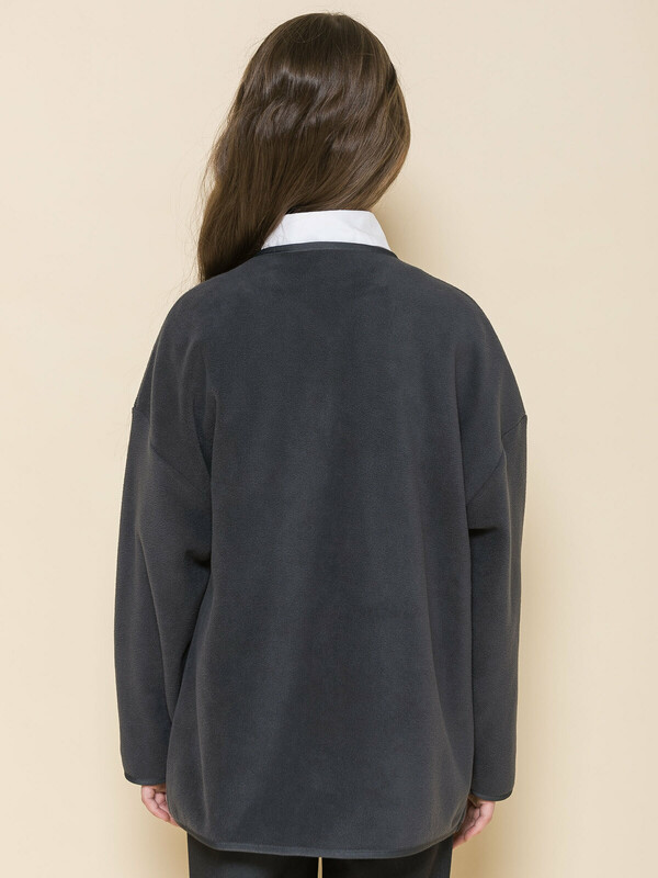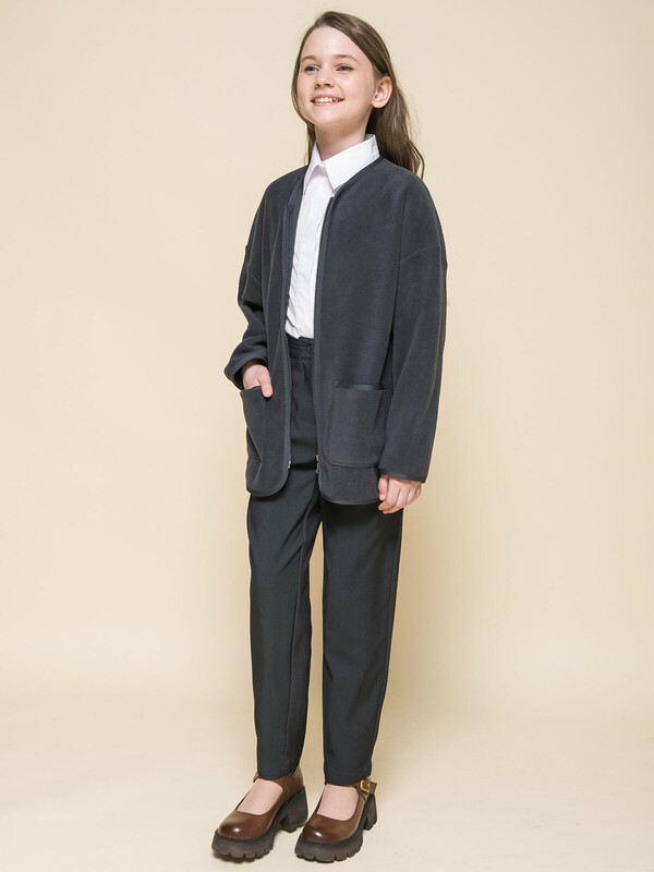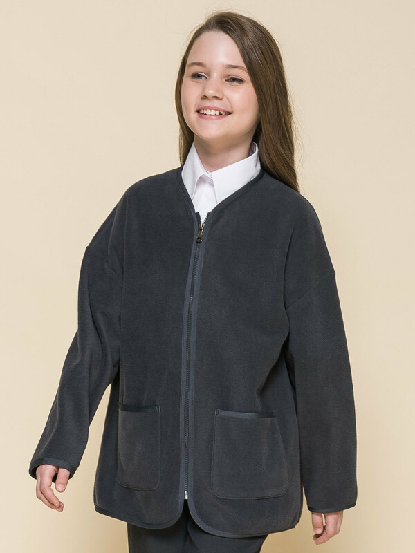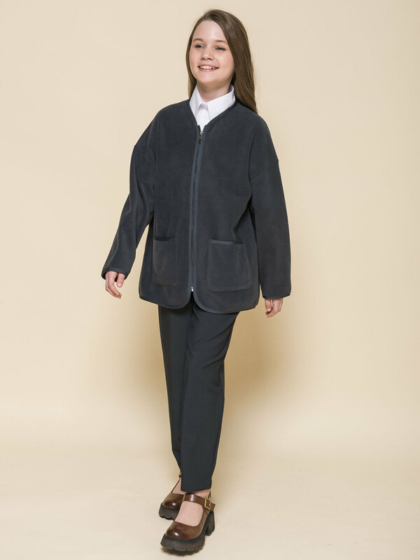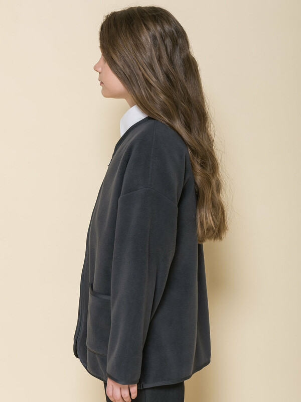 Кардиган свободного силуэта для девочки. Модель выполнена из флиса — материал лёгкий, тёплый и неприхотлив в уходе. Объемный крой, спущенное плечо – настоящий трендовый оверсайз. Тракторная молния максимально прочная, не заедает. По переду два накладных кармана для хранения важных мелочей. Окантовка декоративной трикотажной тесьмой — актуальный модный тренд. Такой кардиган отлично сочетается как с брюками, так и с юбками. Его можно брать на вырост — благодаря свободному силуэту он долго не станет малым. Девочкам с любым типом фигуры в нем будет комфортно в течение всего дня. Стильный и практичный вариант как для Школы, так и за ее пределами.