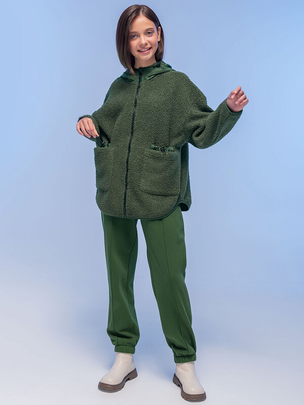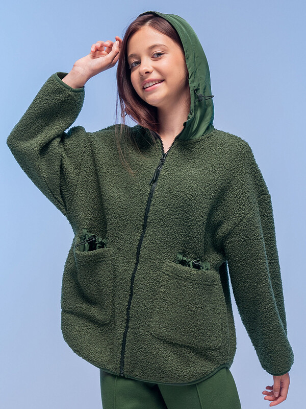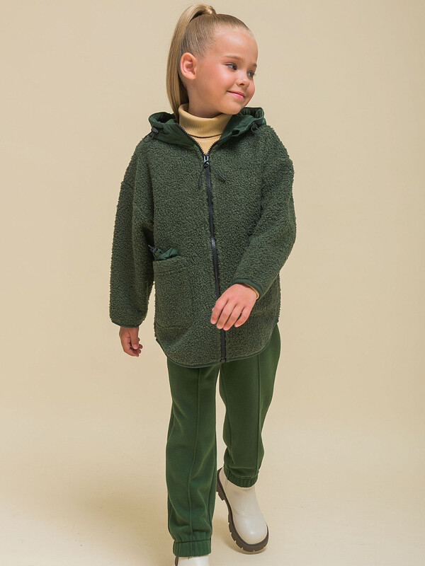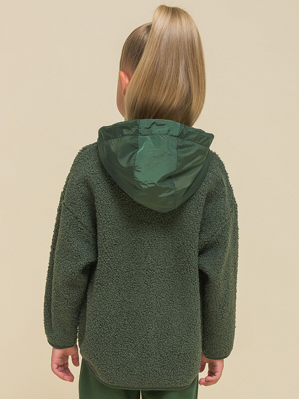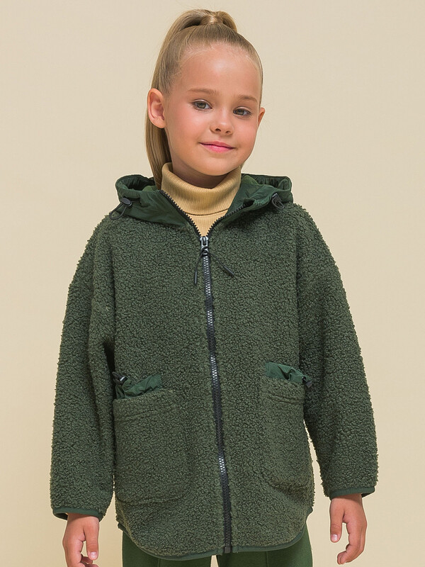 Состав: 100% полиэстер, вставка: 60%нейлон 40%полиэстер Флисовая куртка детская для девочки. Изделие выполнено в сочетании двух материалов: бербер-флиса с мягкой фактурой «барашка» и гладкой курточной ткани. Это один из наиболее актуальных трендов сезона. Капюшон и отделка вдоль застёжки из курточной ткани — максимум практичности. Ребёнок не промокнет, а ткань вдоль молнии не будет мараться при частом использовании. Толстовка детская модного оверсайз-силуэта со спущенным плечом подарит ребёнку комфорт и не будет стеснять его движений. Высокий воротник защищает шею от холода и ветра. По переду застёжка на центральную молнию с крупным пуллером — ребёнку просто застёгивать и расстёгивать. Тканевый стоппер защищает подбородок от зажима молнией. Низ изделия и низ рукавов окантованы эластичной тесьмой — они не растягиваются и сохраняют форму и отличный внешний вид надолго. Куртка с двойными накладными карманами: верхняя часть из основной ткани, внутренняя — из курточной — оригинально и стильно. Объём капюшона и объём внутренних карманов регулируется при помощи эластичной тесьмы со стопперами. Капюшон двухшовный, что обеспечивает анатомически правильную форму и комфортную посадку по голове. Оверсайз-куртка однотонная, без принта. За ней просто ухаживать. Оба материала состоят из полиэстера — толстовка тёплая, лёгкая, мягкая, просто стирается и быстро сохнет, не выгорает и не скатывается, сохраняет отличную форму надолго. Куртка выполнена в зелёном цвете (актуальный оттенок хаки). Размерный ряд: 1 (86); 2 (92); 3 (98); 4 (104); 5 (110); 6 (116); 7 (122); 8 (128); 9 (134); 10 (140); 11 (146). Мягкая куртка идеальна для девочек дошкольного и младшего школьного возраста, а также девочек-подростков. Подходит для детского сада, прогулок, активного отдыха, спорта. Худи с капюшоном можно носить круглогодично: прохладным летом, осенью и весной (демисезон), зимой. Оно может заменить ветровку в начале осени или конце весны, а зимой послужит тёплым средним слоем одежды. Стильный и практичный подарок дочери, внучке или сестре на Новый год и любой другой праздник. Комментарии к товару