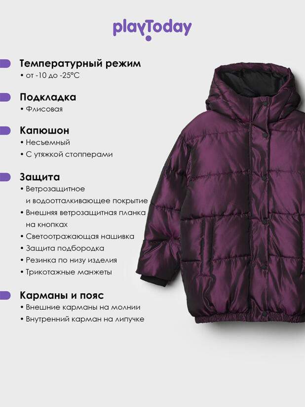 Капюшон с утяжкой-стопперами надёжно фиксируется, защищая от осадков, а вместительные боковые карманы и скрытый внутренний на липучке — настоящая находка для школьницы, которая любит иметь под рукой всё необходимое, особенно, любимые перчатки PlayToday. Бордовый цвет добавляет образу глубины и актуальности — такая модная детская куртка для подростков подойдёт и к джинсам, и к классическим школьным брюкам.