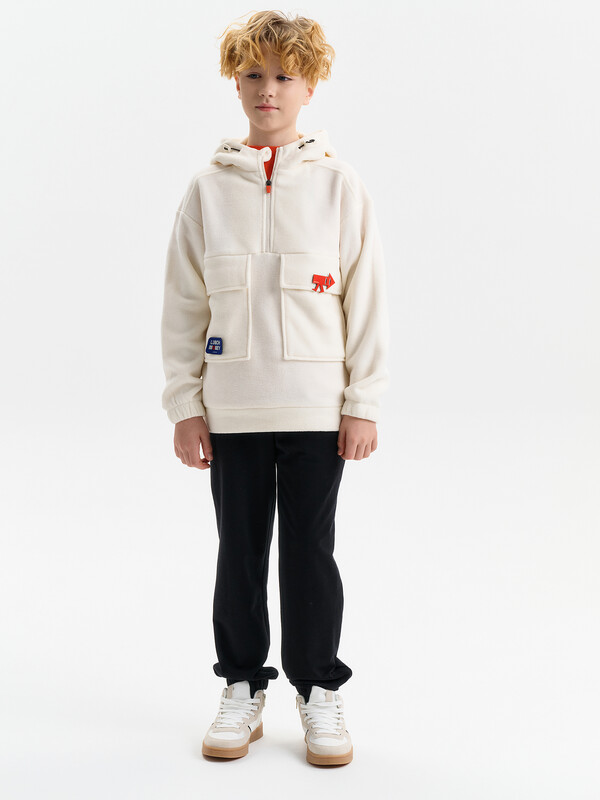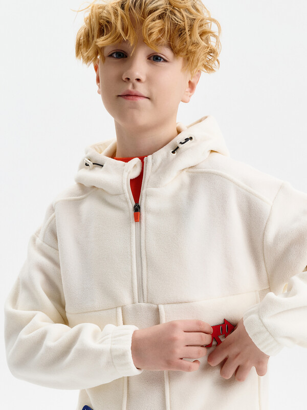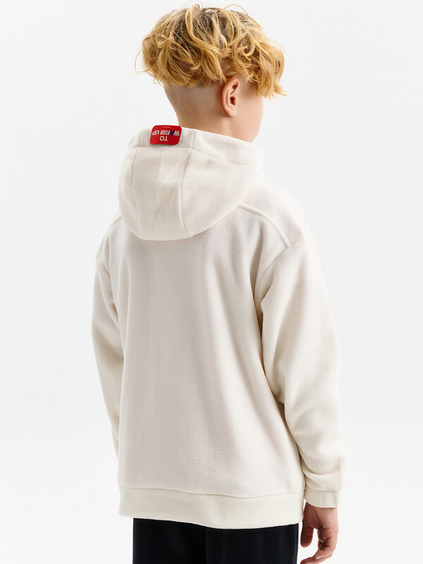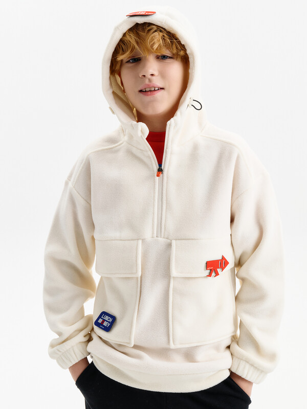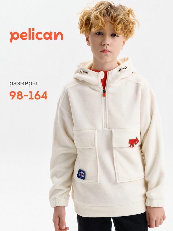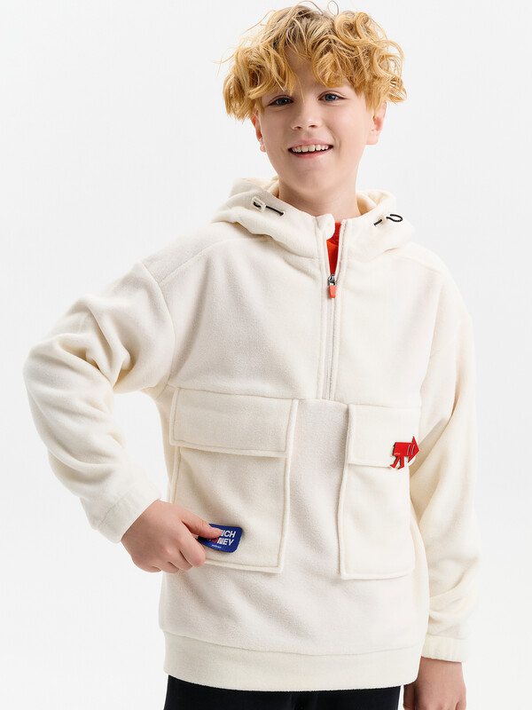 Состав: 100%полиэстер Толстовка флисовая для мальчика со спущенным плеччом из 100% полиэстера. Для удобства надевания в верхней части переда застежка на молнию. По переду большие накладные карманы с клапанами. На спинке кокетка из флиса, переходящая на перед. Низ рукава присборен на внутренний эластик. По низу изделия притачной пояс. Капюшон двухшовный со стойкой по переду и люверсами, высота капюшона регулируется с помощью эластик -корд. Внутренняя обтачка капюшона выполнена из флиса. Перевод текста на капюшоне: чтобы согреться. Перевод текста на кармане: деньги на обед. Комментарии к товару