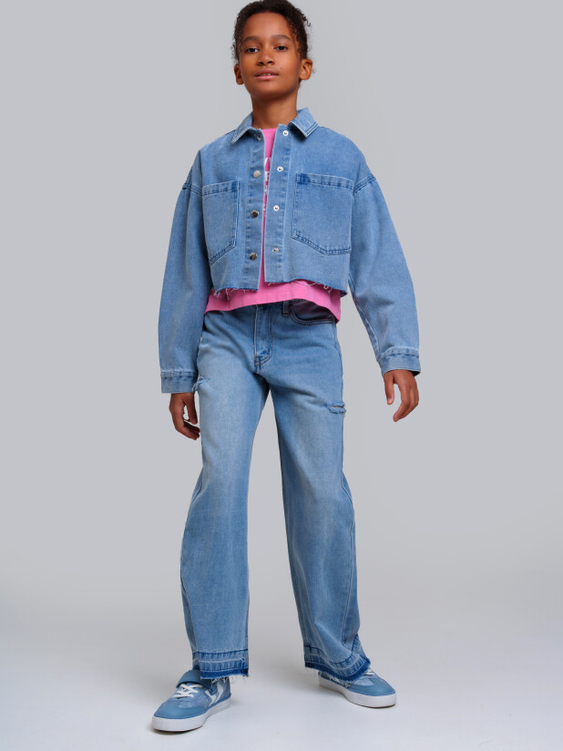 Джинсовка для девочки подростка. Куртка укороченная джинсовая из эластичного денима. Функциональные нагрудные карманы. Средняя длина. Застежка на кнопки.