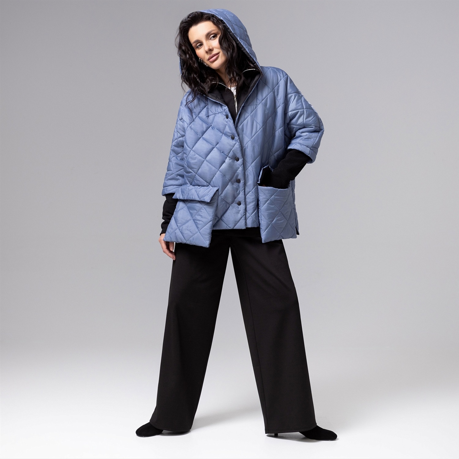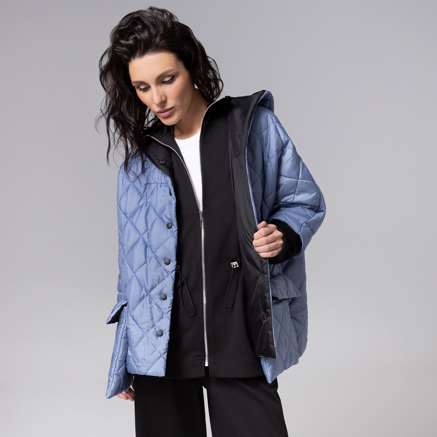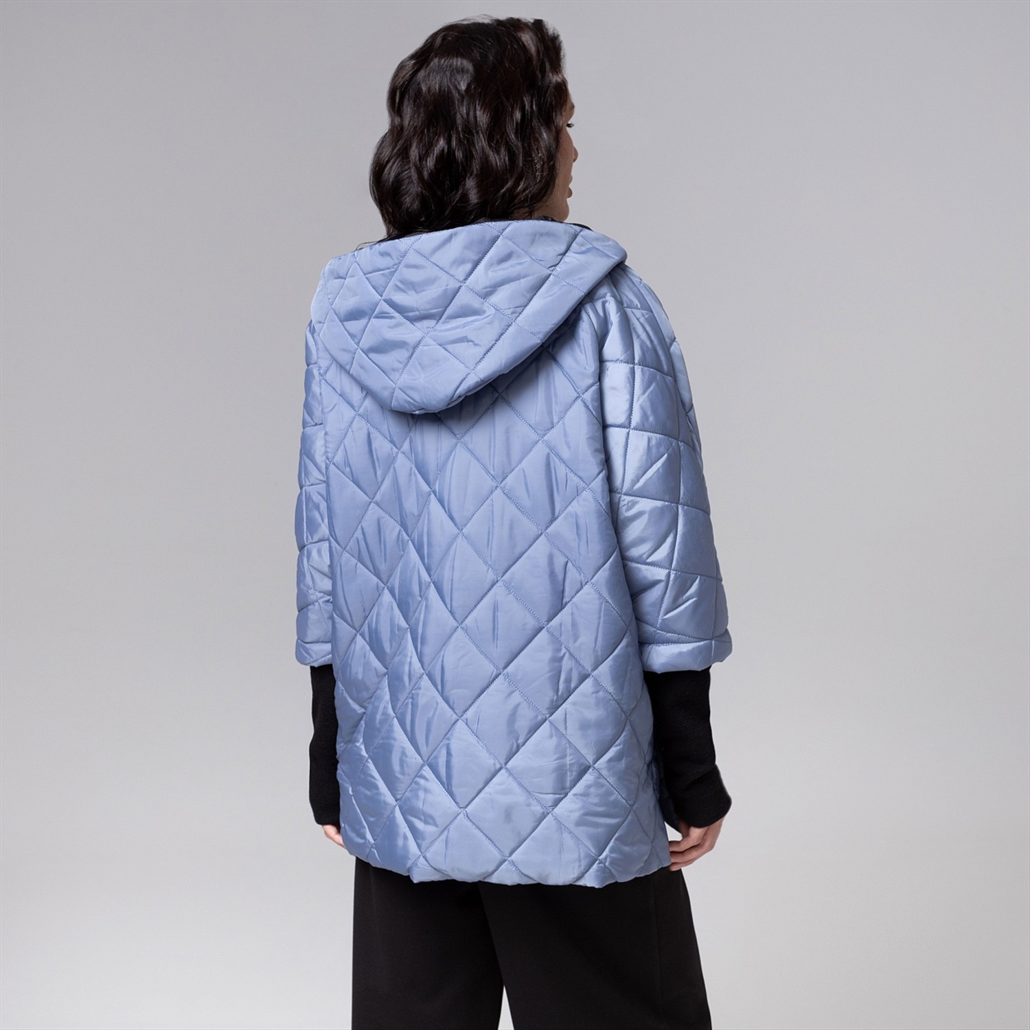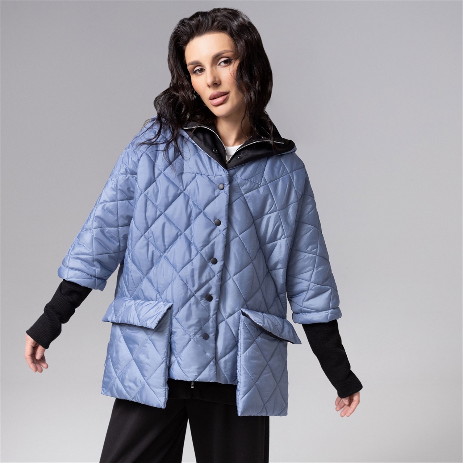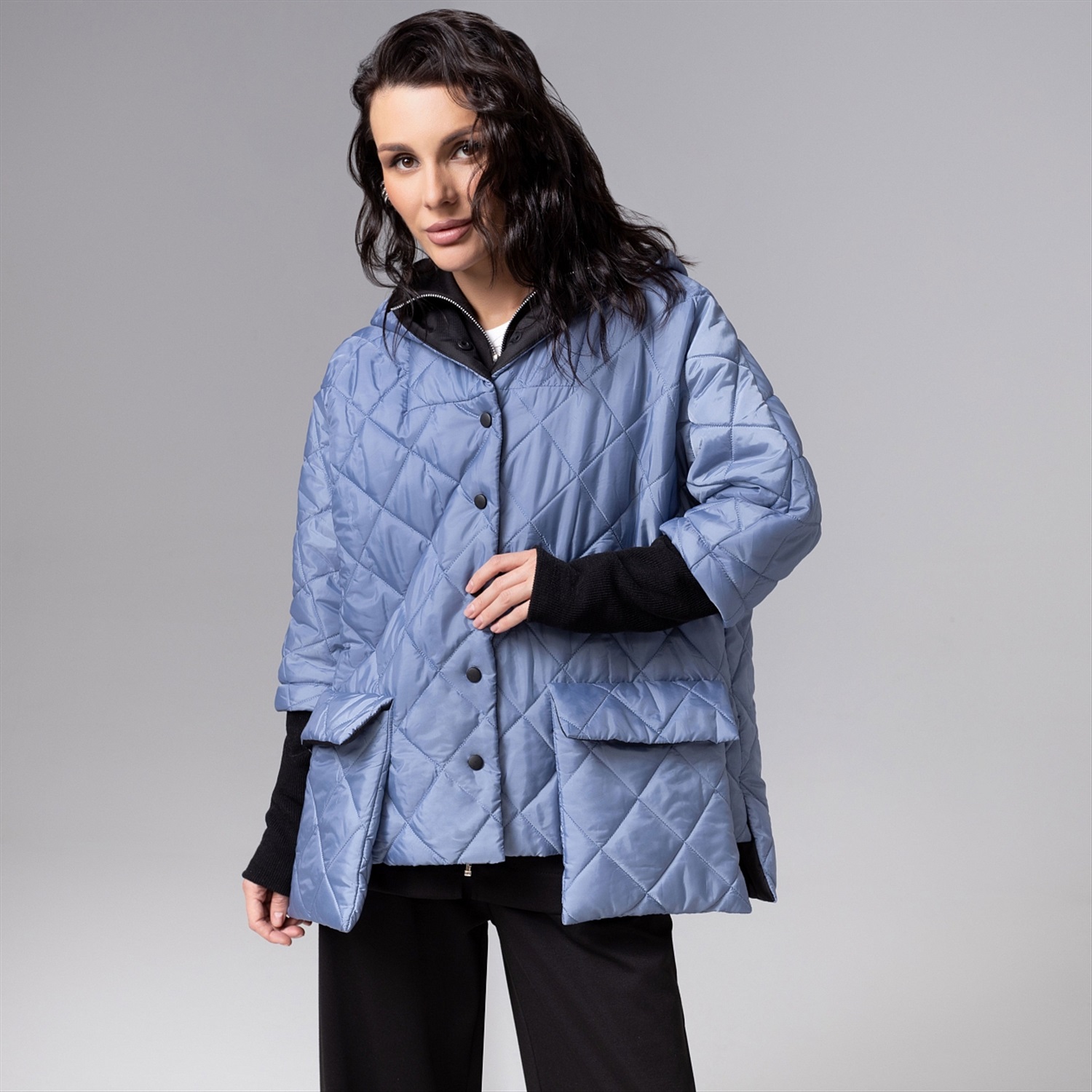 ТН ВЭД: 6102309000; Состав: Курточная стежка на синтепоне, плащёвка, трикотаж «дженифер» (100% п/э); Плотность ткани: Плотная; Тип ткани: Текстиль, трикотаж; Вид застежки: Кнопка/-и; Дополнительный цвет ткани: Черный; Карманы: Накладные; Основной цвет ткани: Голубой; Отрезная талия: Нет; Подклад: Есть; Резинка по талии: Нет; Рисунок/раппорт: Нет, все изделия идентичны; Сезон: Демисезон; Силуэт: Свободный