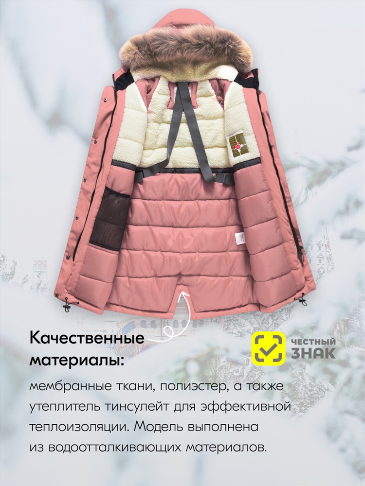 - Съемная меховая опушка: Из натурального меха енота, добавляет стильный акцент и дополнительное тепло.