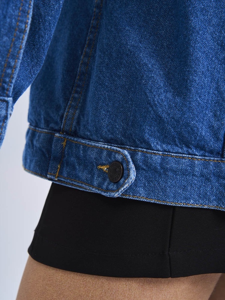 Классическая женская джинсовая куртка свободного покроя. Прямой силуэт, пройма и рукава обеспечивают комфорт и не сковывают движения; по низу рукавов манжеты, застегивающиеся на пуговицу; небольшой воротник; на груди карманы с клапаном, также застегивающимся на пуговицу; функциональные боковые прорезные карманы "в листочку"; на поясе по бокам куртки хлястик и пуговица. Выполнена из неэластичной традиционной плотной ткани denim. Классическая средняя стирка с потертостями по швам.