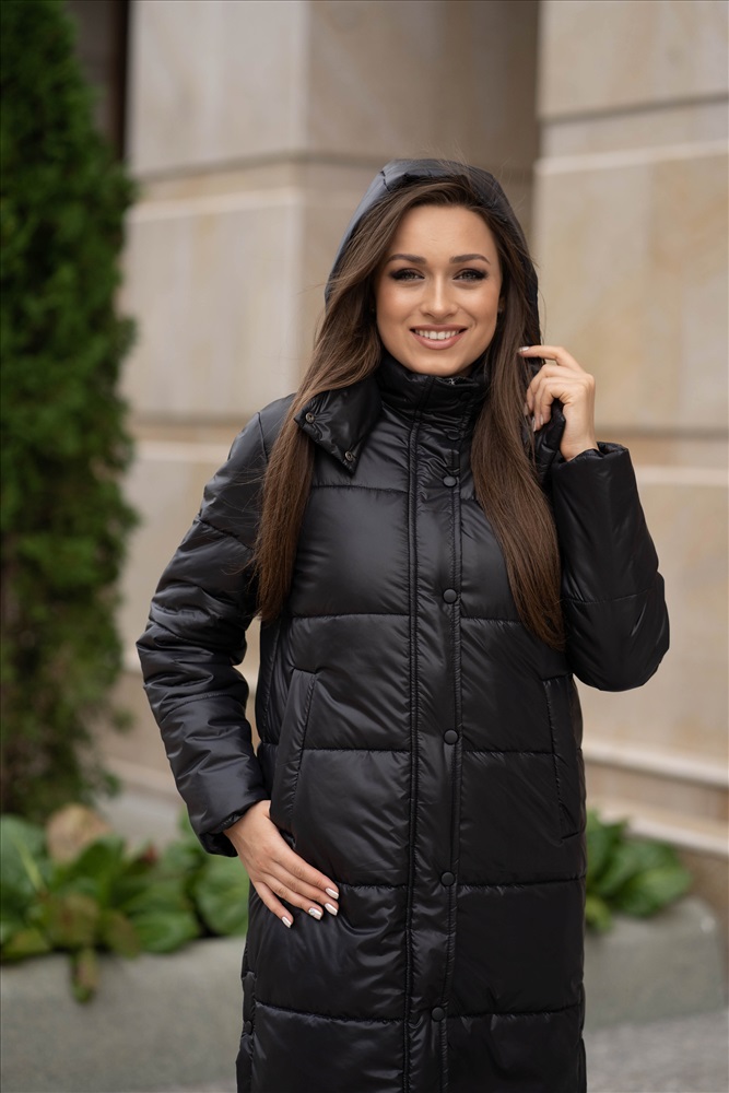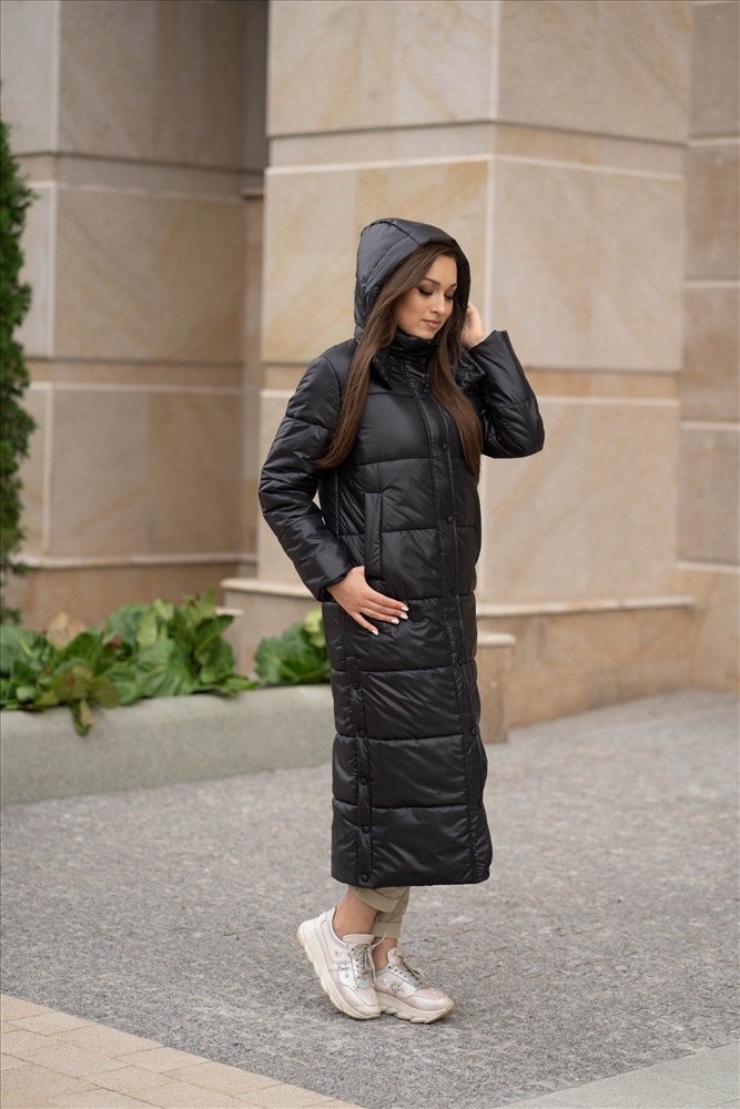 Модель: 22650; Материал: Плащевая ткань; Цвет: черный Описание: Куртка женская демисезонная Прямой силуэт, стеганное Наполнитель - силиконизированный синтепон Застежка-молния,которая закрывается планкой с пробивными кнопками Плечо слегка спущено Воротник-стойка Капюшон съемный на молнии Длина изделия - 120 см Длина рукава -62 см