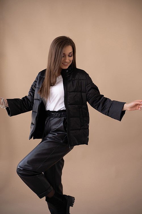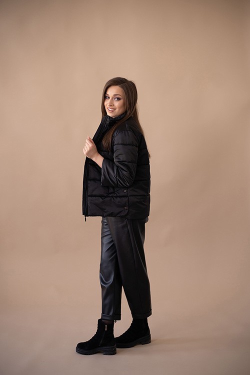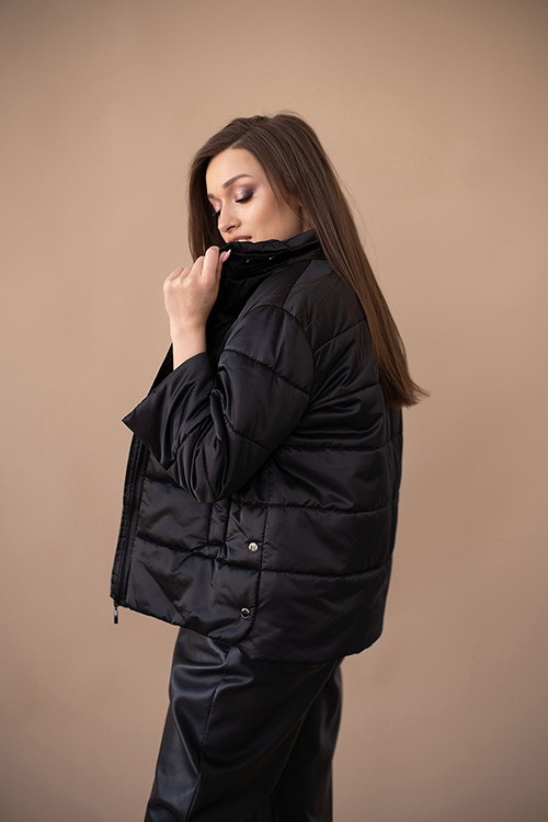 Модель: 23280; Материал: Плащевая ткань; Цвет: черный 2 Описание: Куртка женская демисезонная из плащевой ткани. Наполнитель: синтепон 120 Силуэт прямой. Воротник стойка. Застёжка на молнии. Рукав втачной, длина 7/8. Боковые разрезы на кнопках. Длина рукава 49 см. Длина изделия по спинке 64 см.