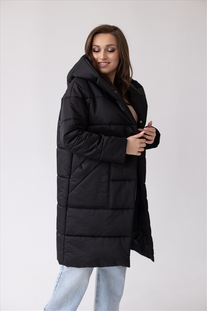 Модель: 23982; Материал: Плащевая ткань; Цвет: черный 2 Описание: Куртка женская демисезонная Прямой силуэт Спущенное плечо Застегивается на 8 пробивных кнопок Капюшон не отстегивается Пояса нет Наполнитель: синтепон плотностью 150 Длина изделия - 101 см Длина рукава с плечом - 72 см