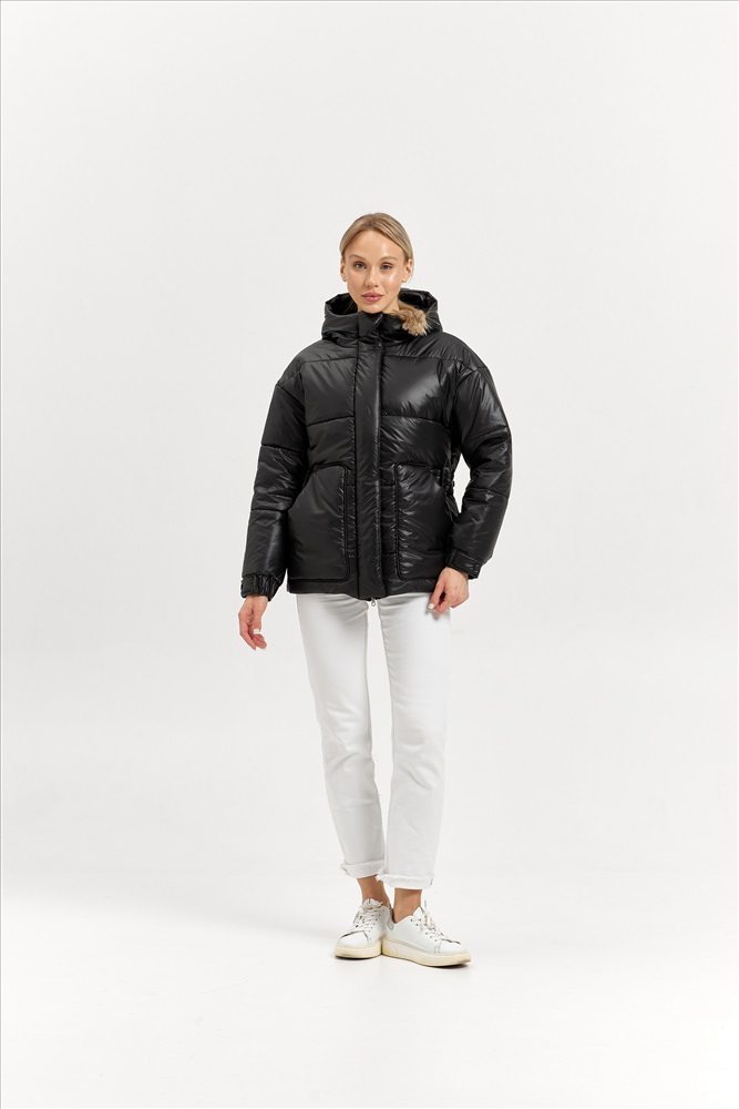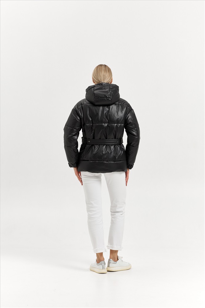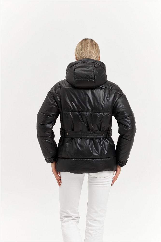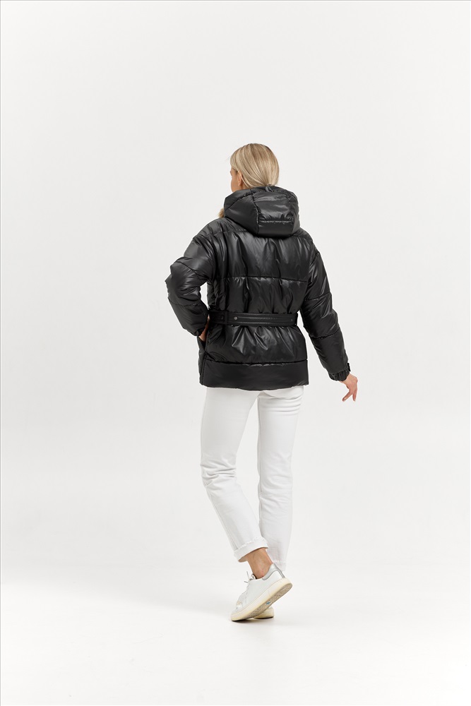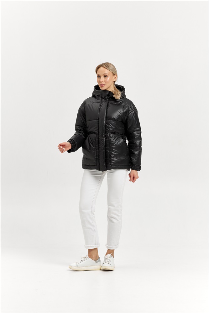 Модель: 25404; Материал: Плащевая ткань (наполнитель - искусственный лебяжий пух); Цвет: черный; Состав: 100% полиэстер Описание: Куртка зимняя Ткань- плащевая, ЛЕБЯЖИЙ ПУХ 250 Изделие стеганное, оверсайз. Рукав 1-шовный со спущенным плечом, на манжете. Длину манжеты можно регулировать кнопками на пате. Ширина манжеты 5 см. Капюшон со средней вставкой, впереди со стойкой. Застёжка центральная на молнию и планку с потайными кнопками. Пояс передний с пряжкой, выходит из-под кармана. Пояс спинки на кнопках регулирует объем талии. Карманы накладные с кантом. Длина рукава от горловины  с манжетой 75,5 см. Длина изделия по спинке 72 см.
