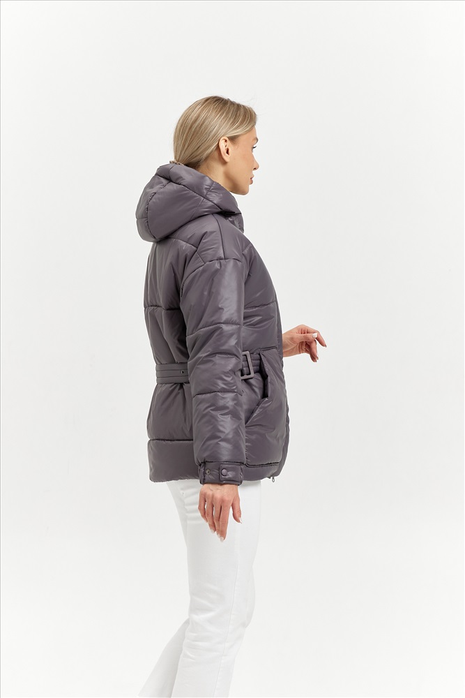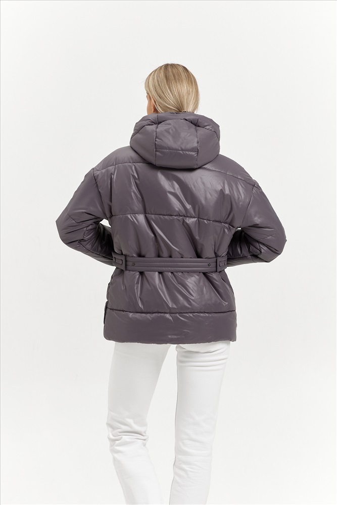 Пояс передний с пряжкой, выходит из-под кармана. Пояс спинки на кнопках регулирует объем талии.
