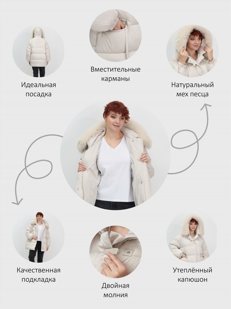 Великолепный натуральный мех песца на капюшоне подчеркнет вашу индивидуальность. Съемная опушка позволяет менять образ от делового до casual-шика. Безупречное качество меха и его мягкое сияние говорят о вашем безупречном вкусе и статусе.