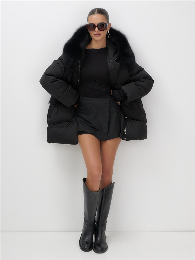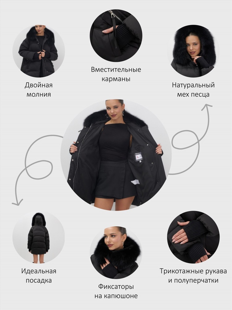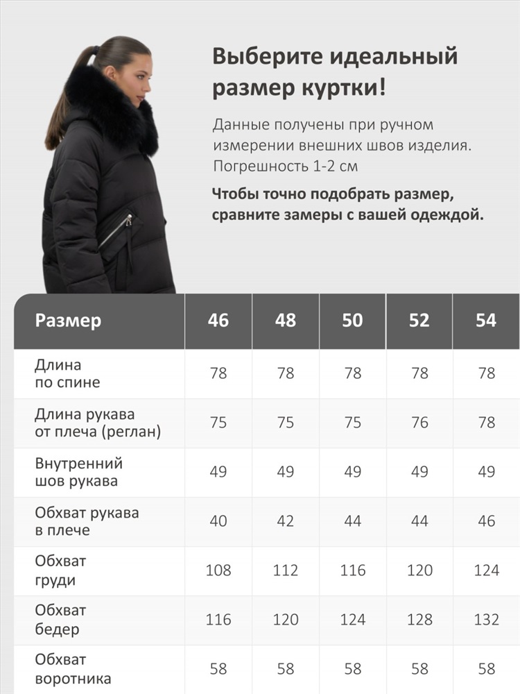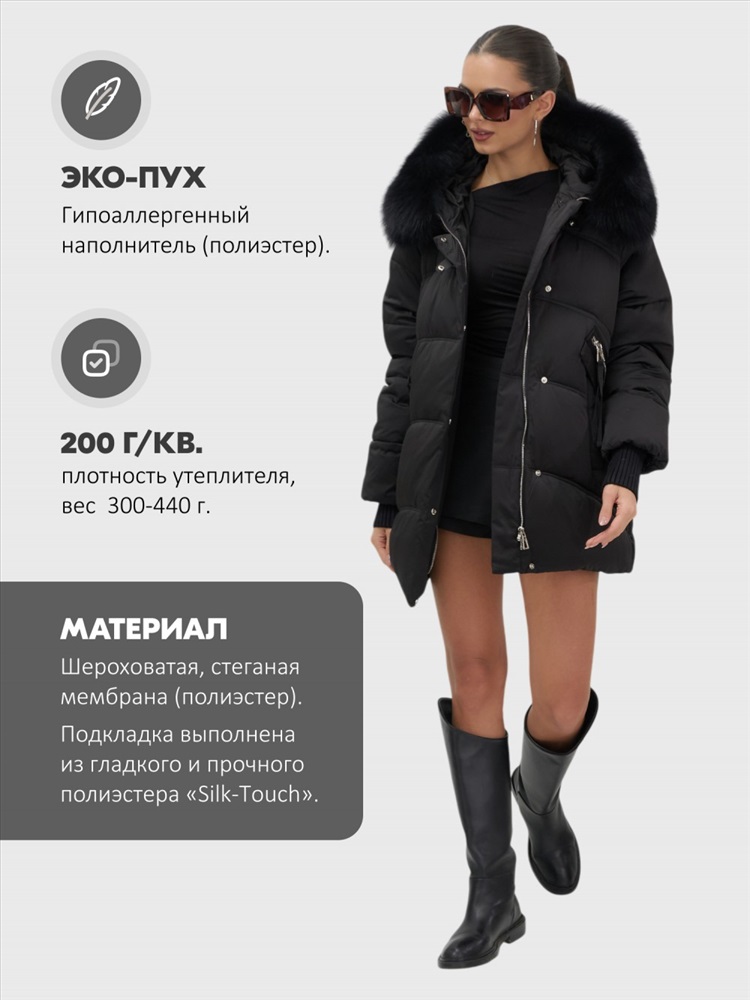 Пять трендовых оттенков сезона осень-зима 2025 – глубокий черный, благородный коричневый, нежный светло-коричневый, изысканный темно-зеленый и элегантный бежевый – идеально сочетаются с роскошным мехом песца. Удлиненный силуэт до колена и свободный крой создают идеальные пропорции для размеров 46-54.