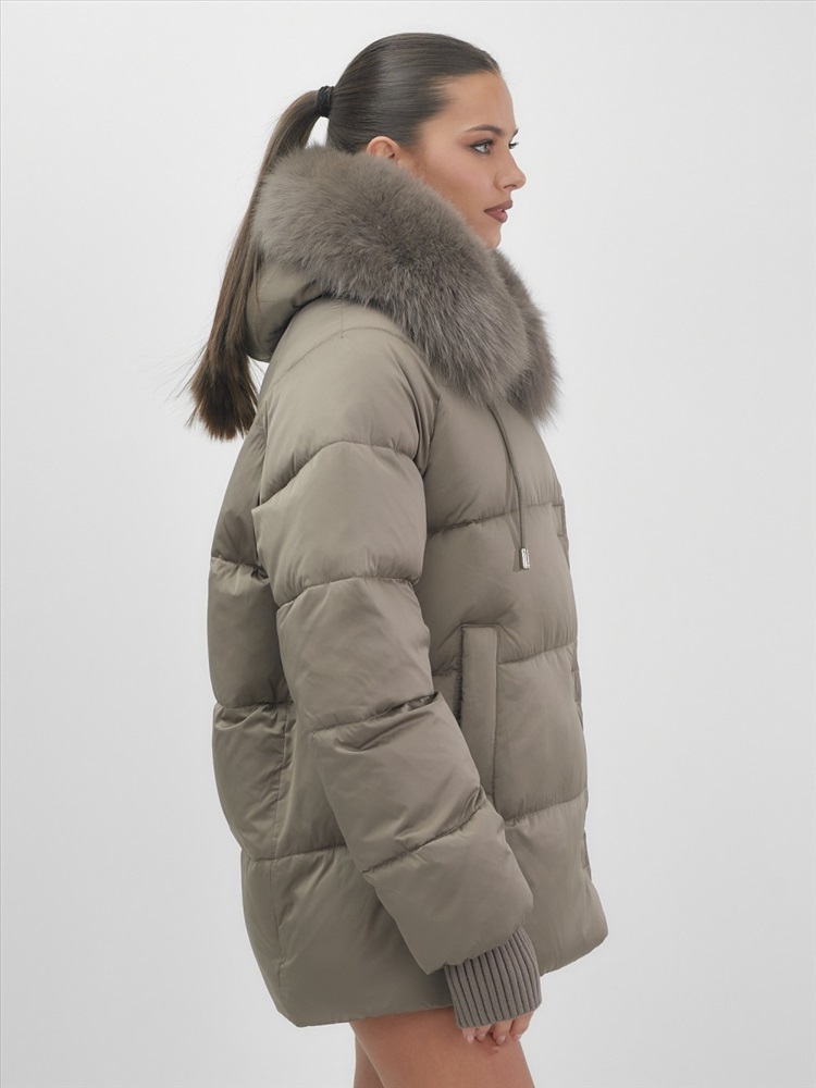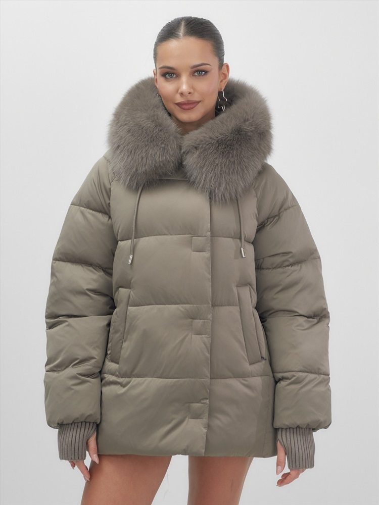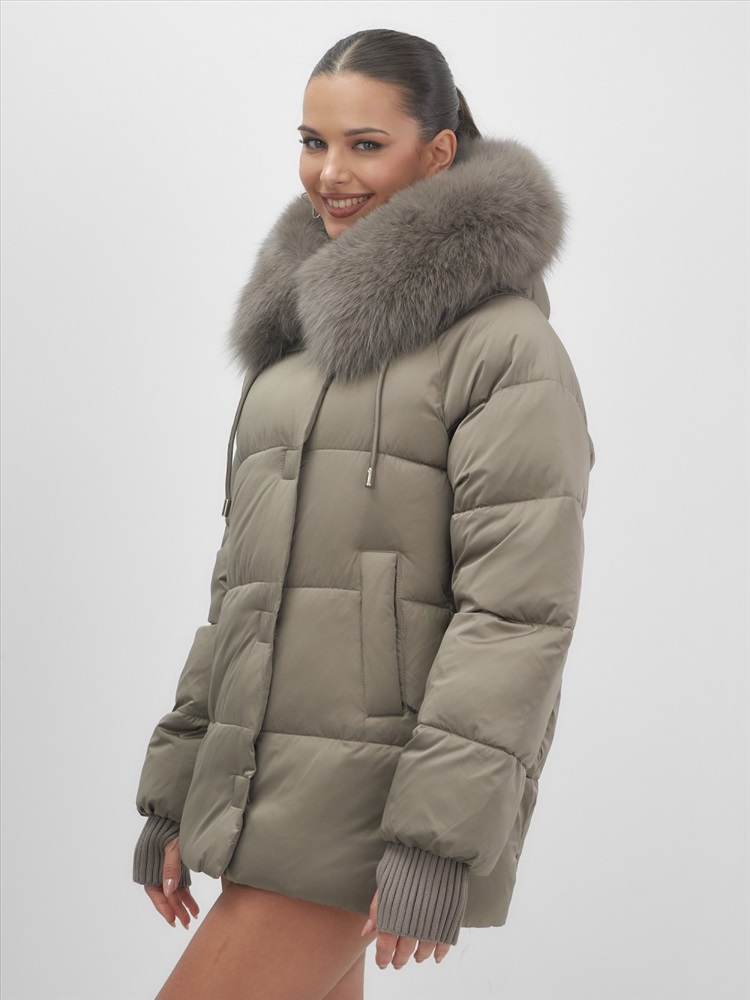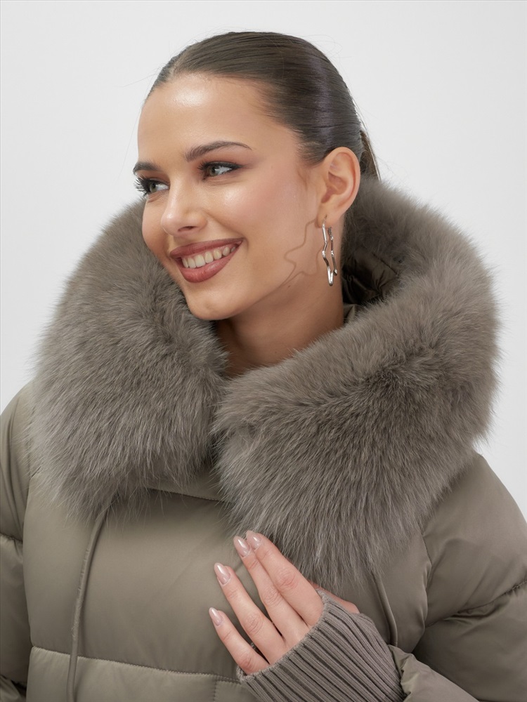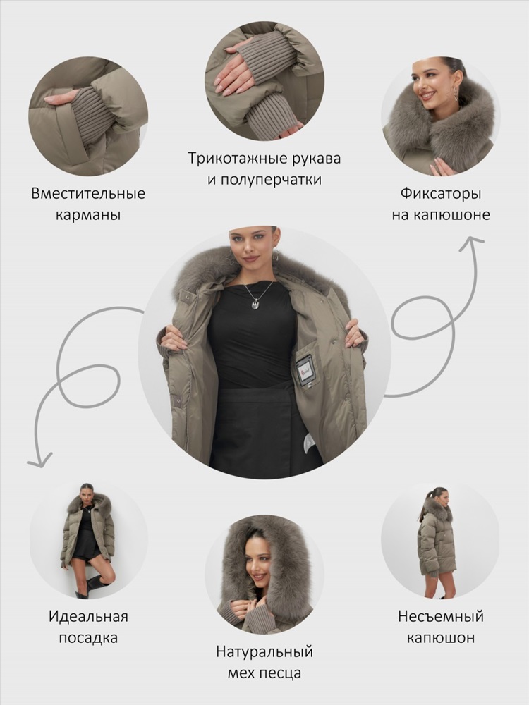 Четыре актуальных оттенка коллекции осень-зима 2025 – классический черный, роскошный коричневый, изысканный светло-коричневый и трендовый горчичный – великолепно гармонируют с натуральным мехом песца. Длина до бедра и свободный крой создают идеальные пропорции для размеров 44-52.