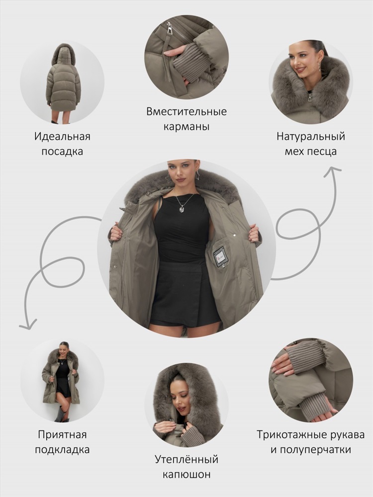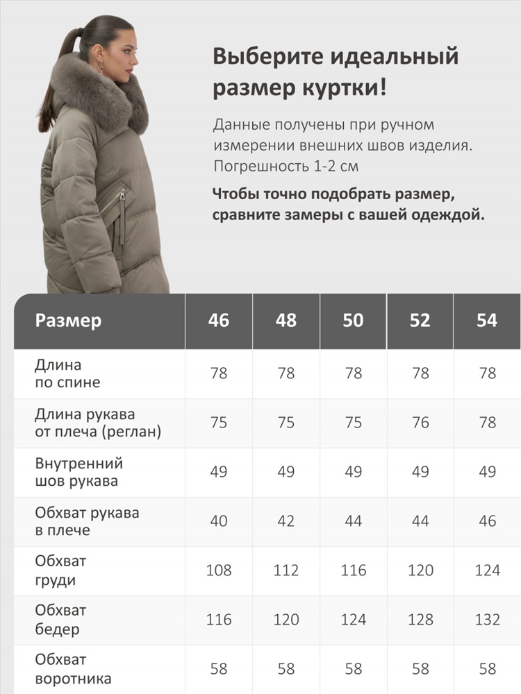Пять трендовых оттенков сезона осень-зима 2025 – глубокий черный, благородный коричневый, нежный светло-коричневый, изысканный темно-зеленый и элегантный бежевый – идеально сочетаются с роскошным мехом песца. Удлиненный силуэт до колена и свободный крой создают идеальные пропорции для размеров 46-54.