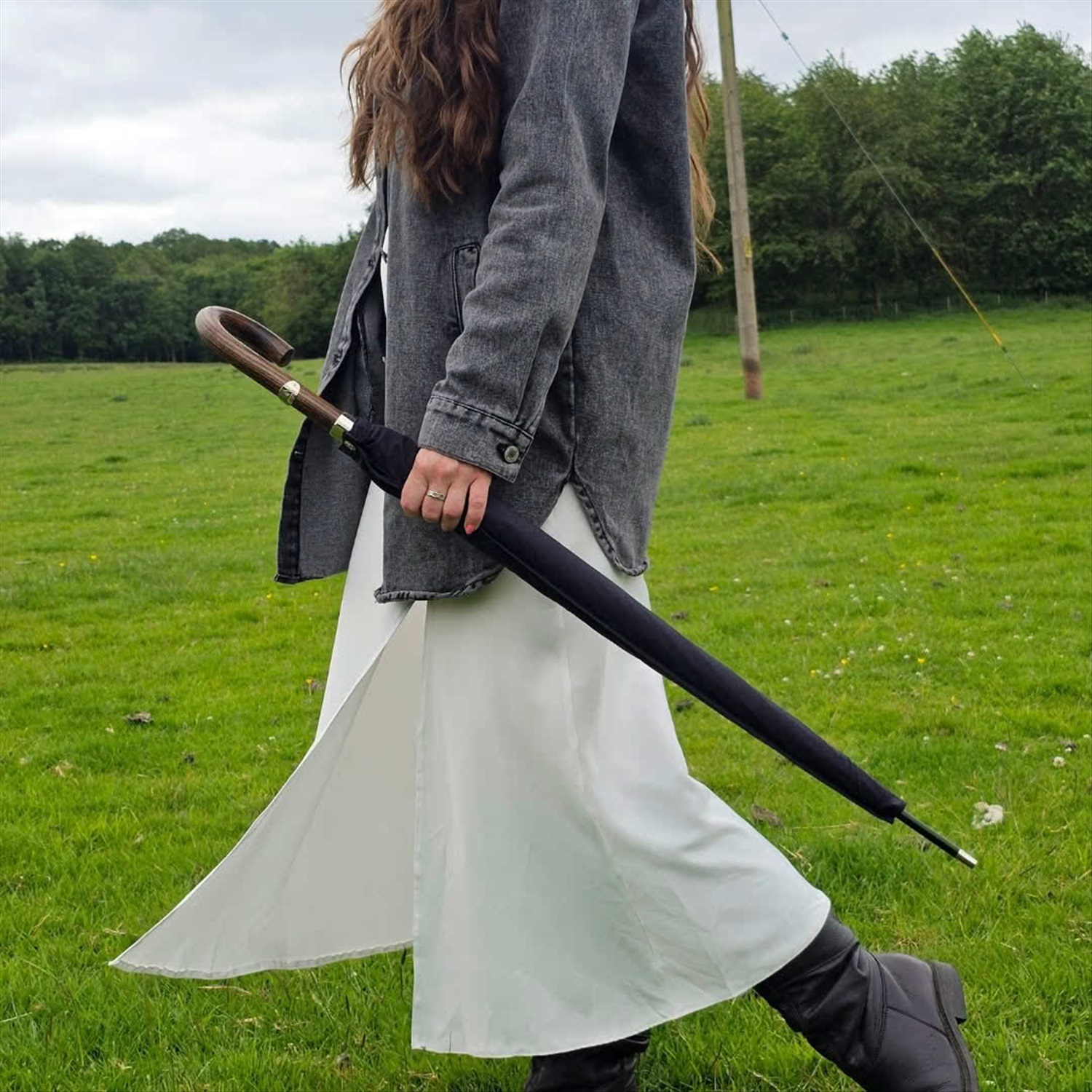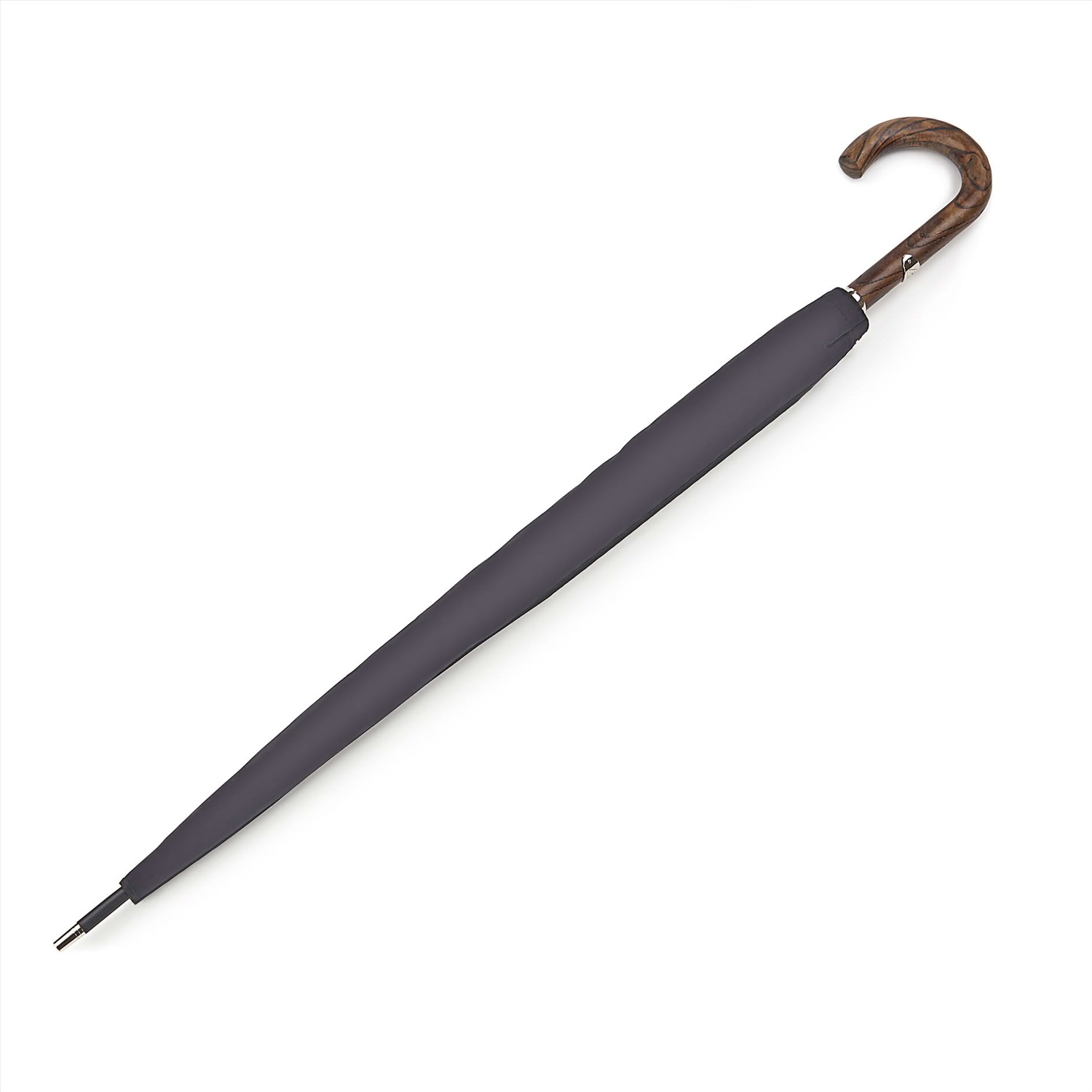 Материал спиц: фибергласс, Респектабельный черный зонт с удобной деревянной ручкой. Большой купол сделан из прочного люксового поликоттона (65% полиэстера и 35% хлопка), этот материал очень красиво и дорого смотрится на свет. Спицы заправляются под металлическое кольцо, окантовывающее ручку. Каркас ветроустойчивый. Логотип находится на изящной бирке, прикрепленной на рукоятке, и на кнопке хлястика.