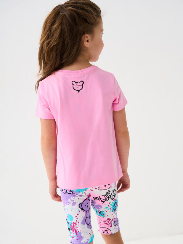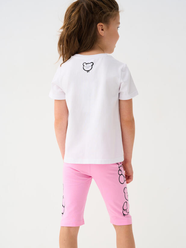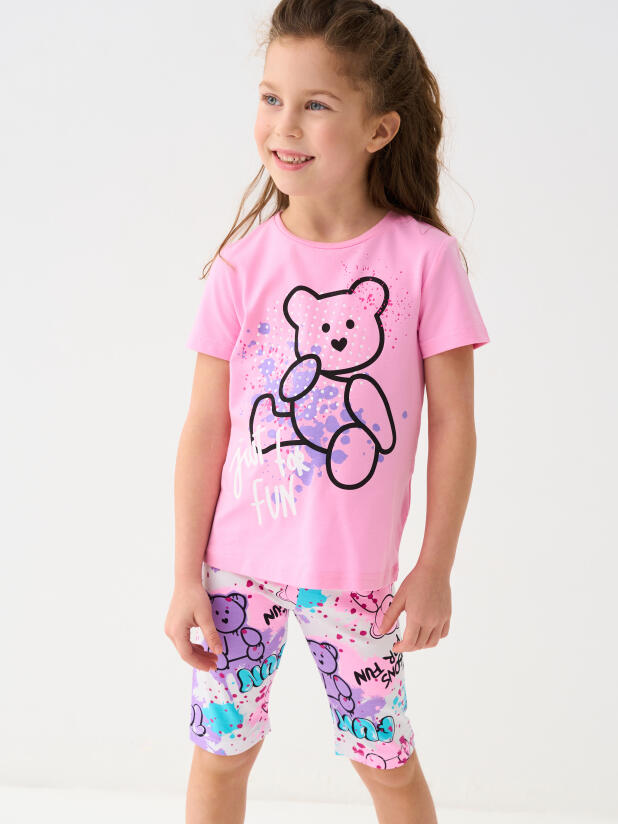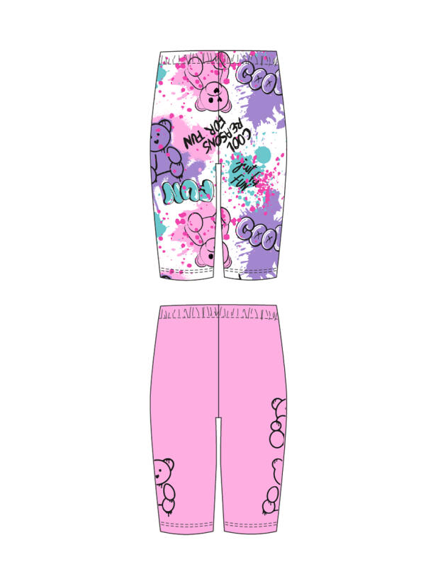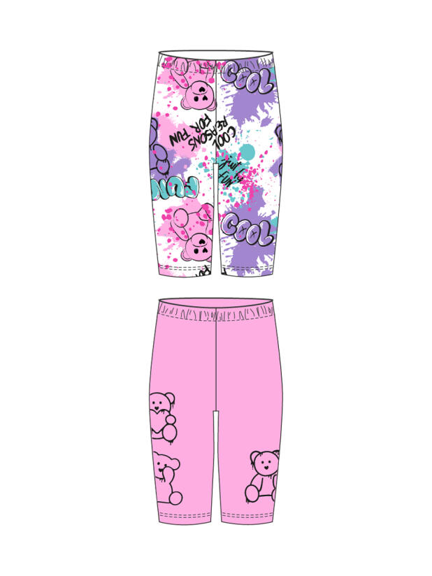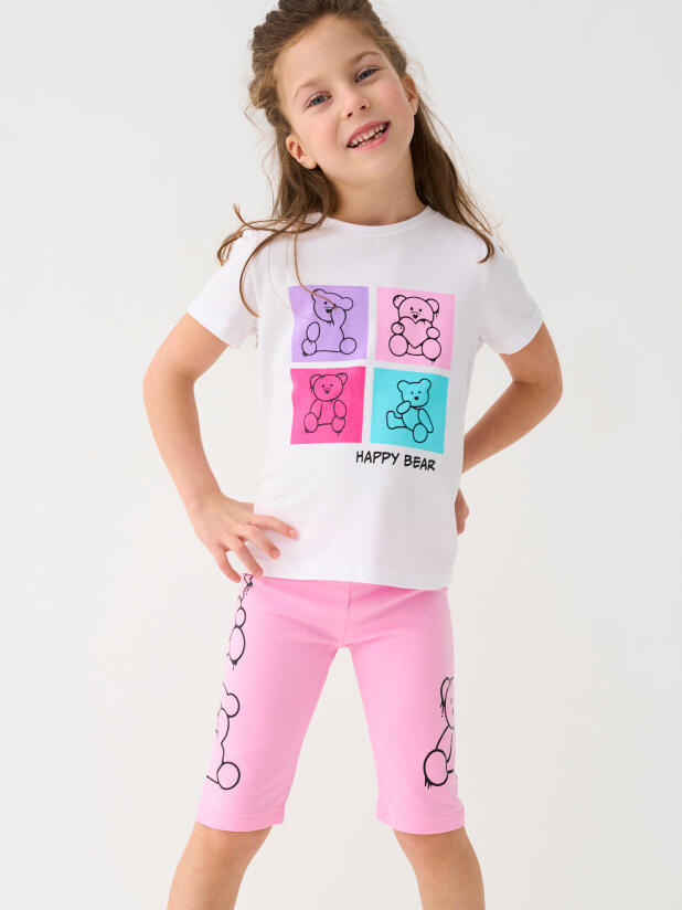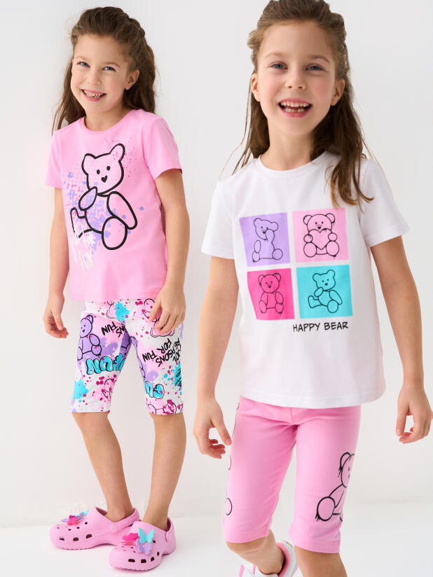Набор детских легинсов для девочки. Комплект состоит из двух пар укороченных легинсов. Первая пара выполнена в розовом цвете, вторая — с ярким принтом с медведями. Обе модели имеют высокую посадку и эластичный пояс, который хорошо фиксирует изделие на талии. Материал - мягкий, хлопковый трикотаж.
