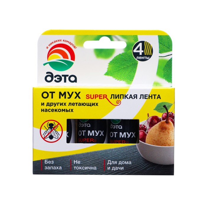 Производитель: ДЭТА; Габариты: 10 x 10 x 2,5; Страна: Россия; В боксе: 24 шт; Состав: См. на упаковке; Материалы: см. на упаковке; Фасовка: по 1 шт; Индивидуальная упаковка: Цветная картонная коробка; Сертификат: РСТ; Область применения: От клещей; Назначение: От мух; Тип средства: Инсектицид ОписаниеДэта супер липкая лента от мух 4 штПредназначена для борьбы с надоедливыми мухами и другими летающими насекомыми. Без запаха, не токсична. Для дома, дачи и пикника. Рекомендовано использовать 2–3 штуки на каждые 10 м² площади. Средство длительного действия. Замена требуется только по мере заполнения ленты насекомыми. Состав: растительные и минеральные масла, смола хвои, каучуки, экстракт меда