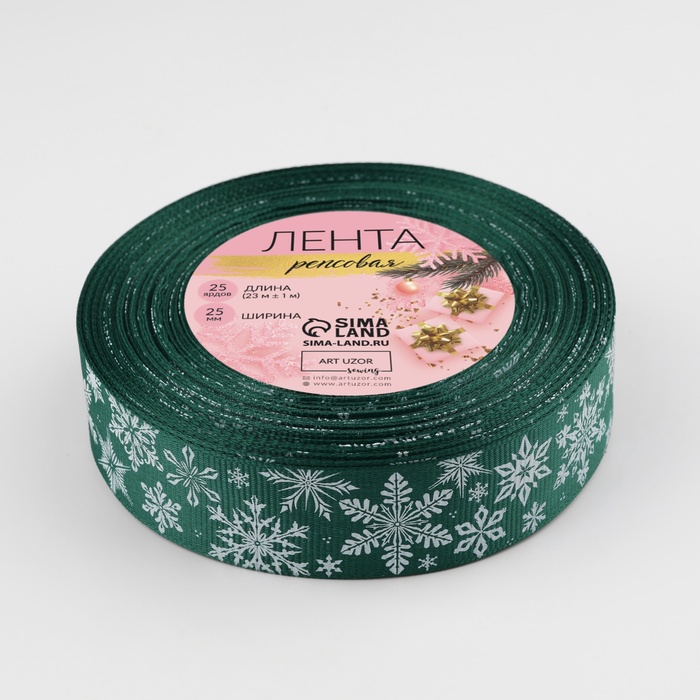 Лента репсовая «Праздничные снежинки», 25 мм, 23±1 м, зелёная