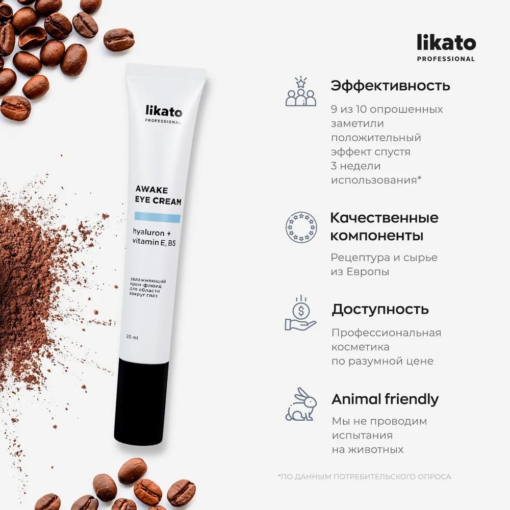 Увлажняющий крем-флюид для области вокруг глаз. Крем-флюид Awake Eye Cream бережно ухаживает за нежной кожей вокруг глаз, помогает избавиться от мелких морщин, темных кругов и отечности под глазами. Подходит для всех типов кожи. Гиалуроновая кислота глубоко увлажняет и восстанавливает гидробаланс кожи, уменьшает видимость и глубину морщин. Мочевина насыщает кожу влагой, способствует устранению раздражений и шелушений. Кофеин борется с отечностью и оказывает лимфодренажный эффект. Масла миндаля и какао разглаживают кожу, интенсивно питают и омолаживают. Витамины E и B5 борются со свободными радикалами, повышают упругость и эластичность кожи.