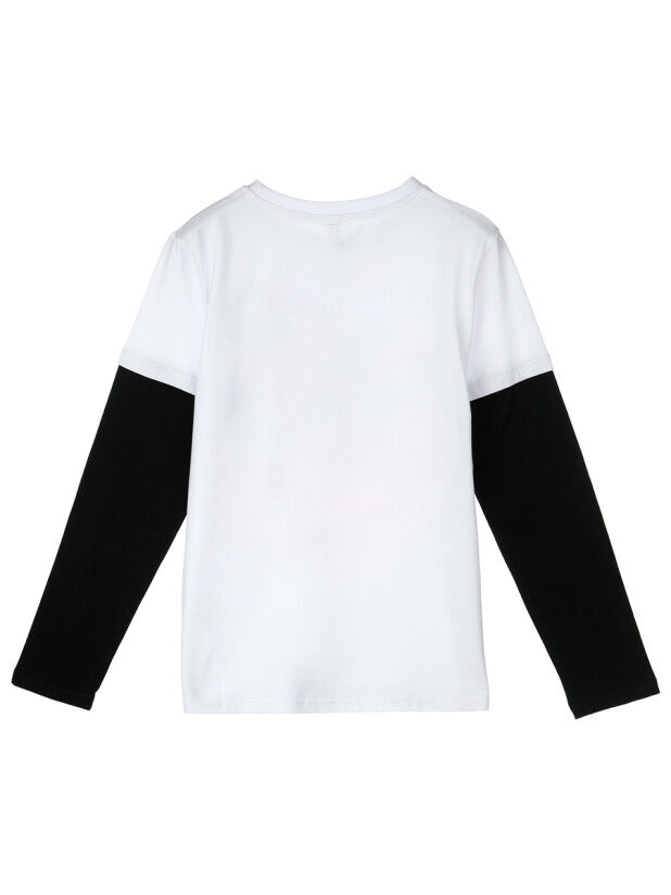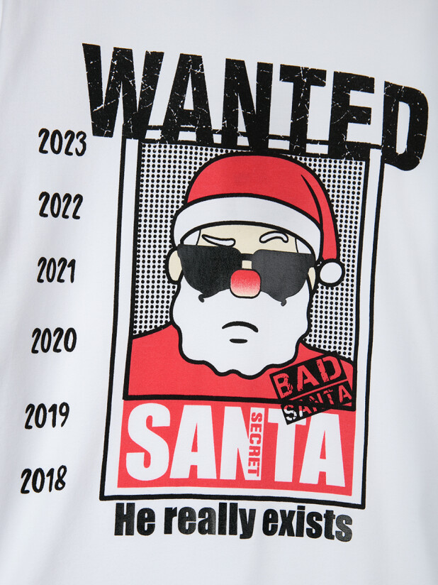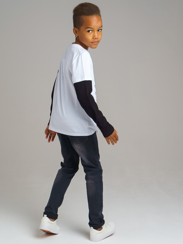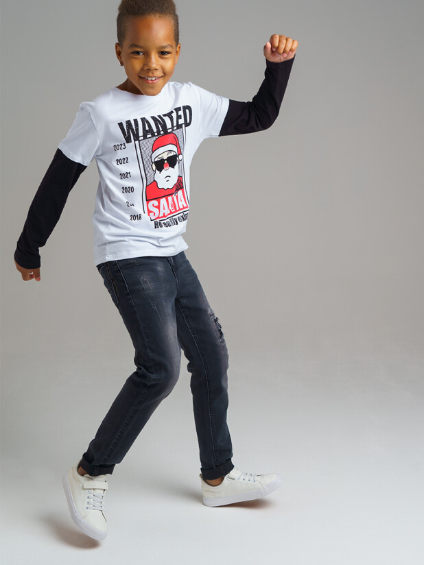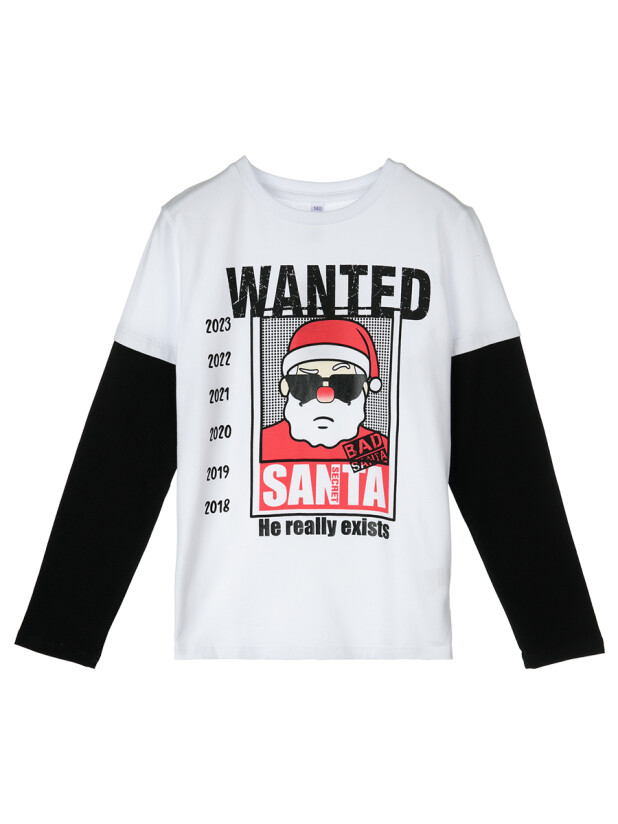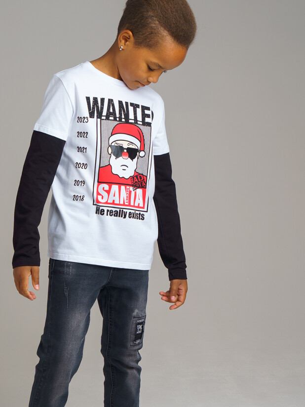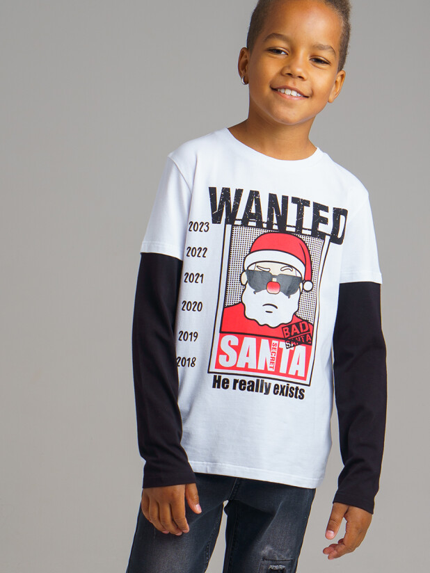 Лонгслив из качественного приятного на ощупь трикотажа. Высокое содержание хлопка 95%. Благодаря наличию эластана в составе ткани изделие проще в уходе и держит форму. Рукав с имитацией многослойности. Новогодний принт с акцентно глянцевой текстурой.