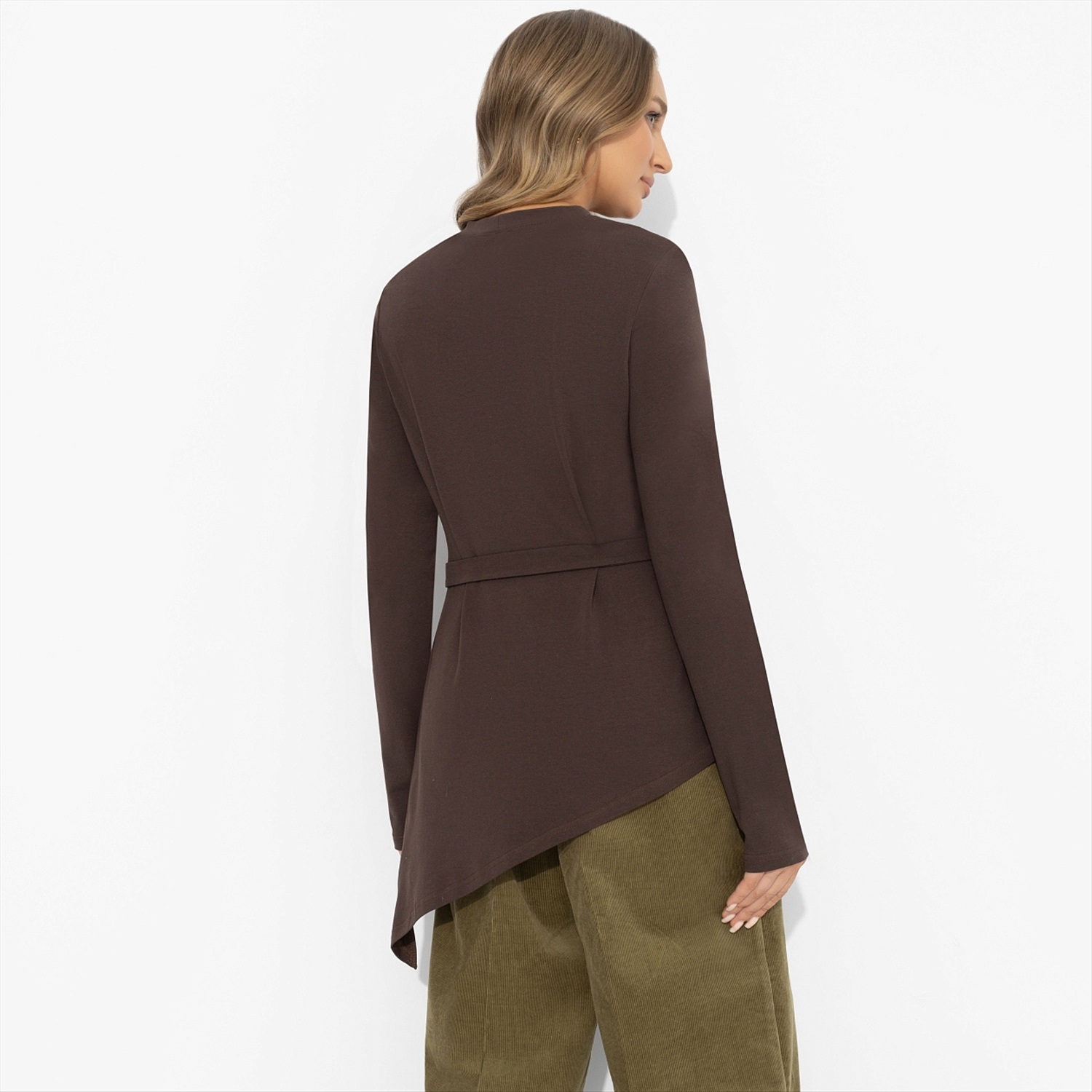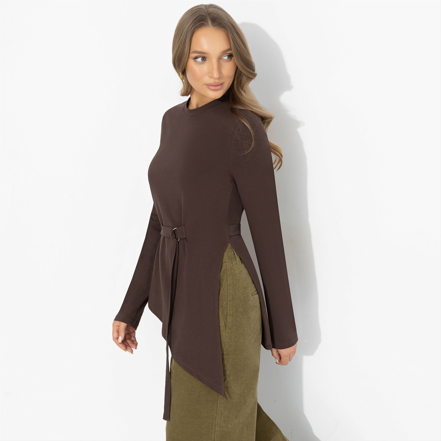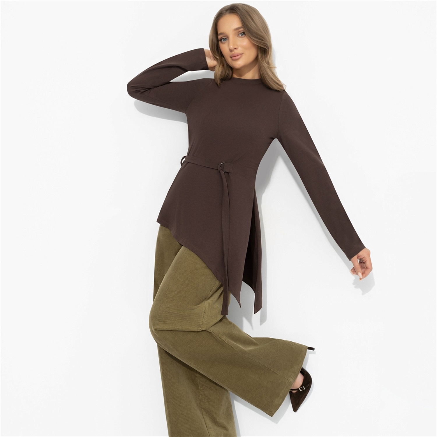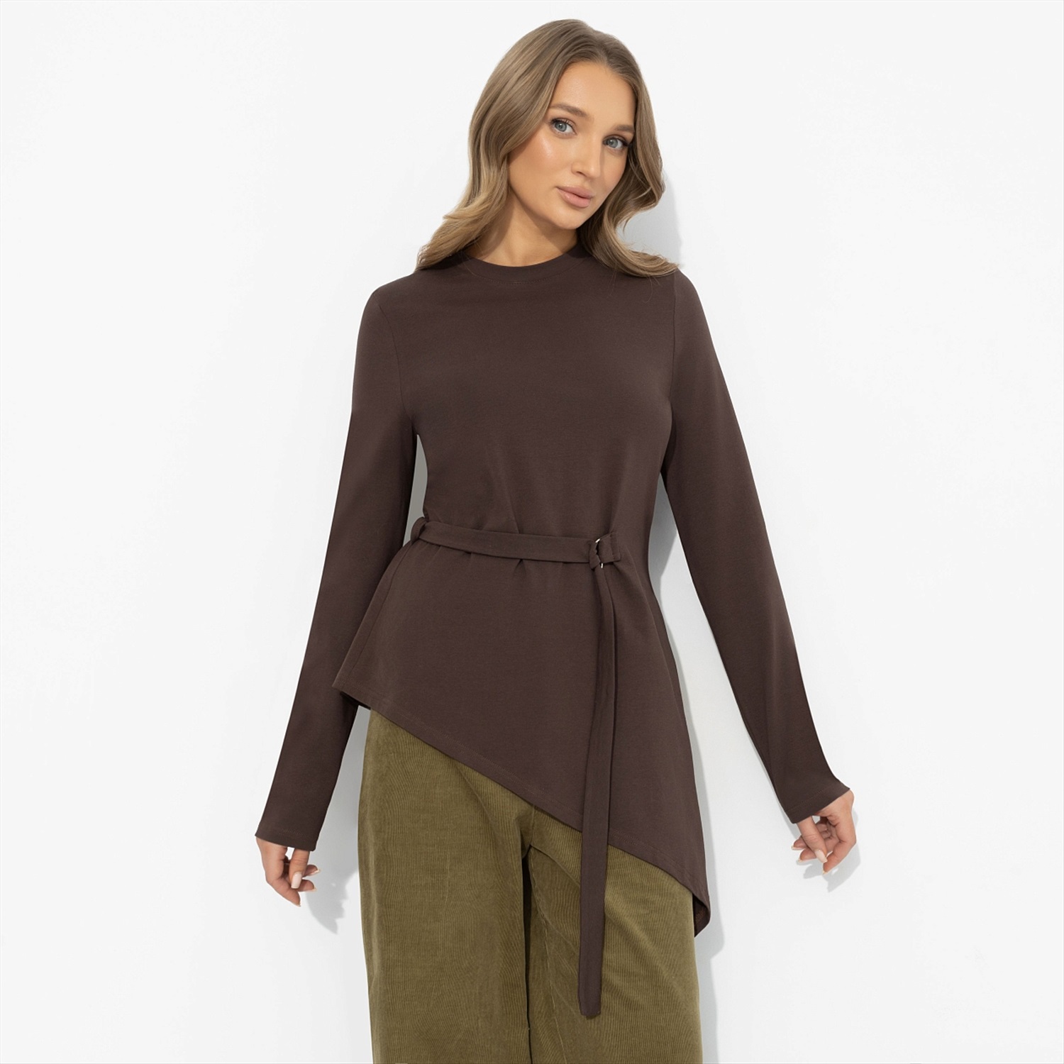 Греческие богини не носили лишнего – только изгибы своего тела, драпировки и уверенность. В 2026 мода твердит нам о том же: асимметрия, мягкое прилегание, акцент на талию и природные оттенки. Эта модель будто сошла с античной фрески, но живет абсолютно в сегодняшнем дне. Туника ЧАРУТТИ с асимметричным низом и поясом формирует текучий силуэт, а длинный рукав балансирует пропорции. Эластичный трикотаж красиво драпируется, подчеркивает фигуру и идеален в движении – помогает образу оставаться спокойным и величественным.
