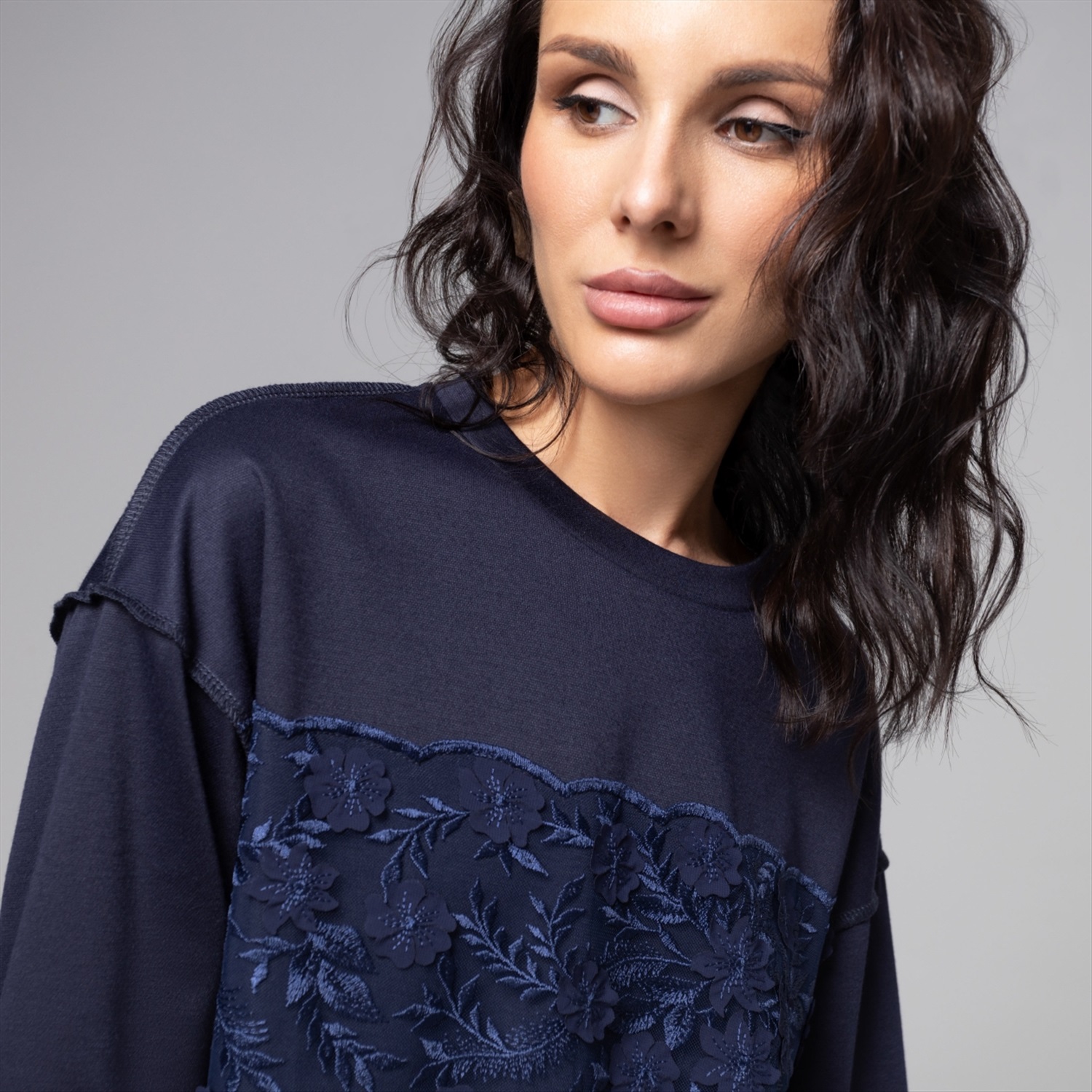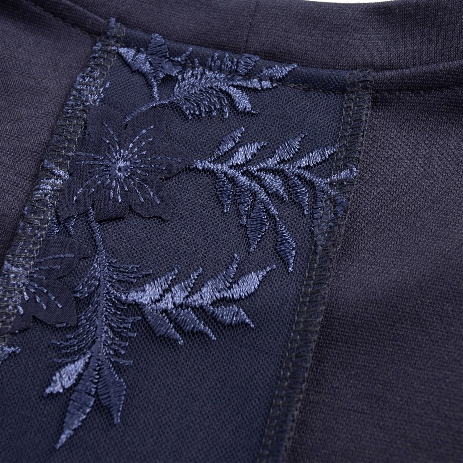 ТН ВЭД: 6110309900; Состав: Трикотаж «пике», сетка с вышивкой (80% п/э, 15% вискоза, 5% спандекс); Плотность ткани: Плотная; Тип ткани: Трикотаж; Вид застежки: Нет; Карманы: Нет; Основной цвет ткани: Синий; Отрезная талия: Нет; Подклад: Нет; Резинка по талии: Нет; Рисунок/раппорт: Нет, все изделия идентичны; Сезон: Круглогодичный; Силуэт: Свободный; Стиль: Повседневный