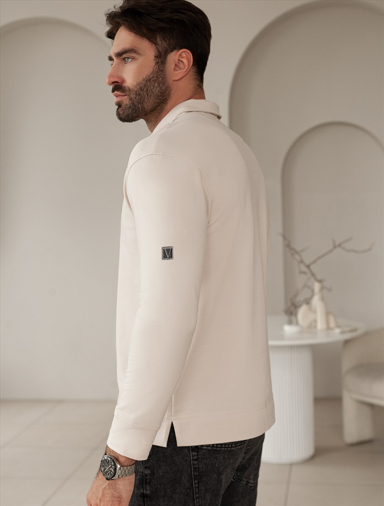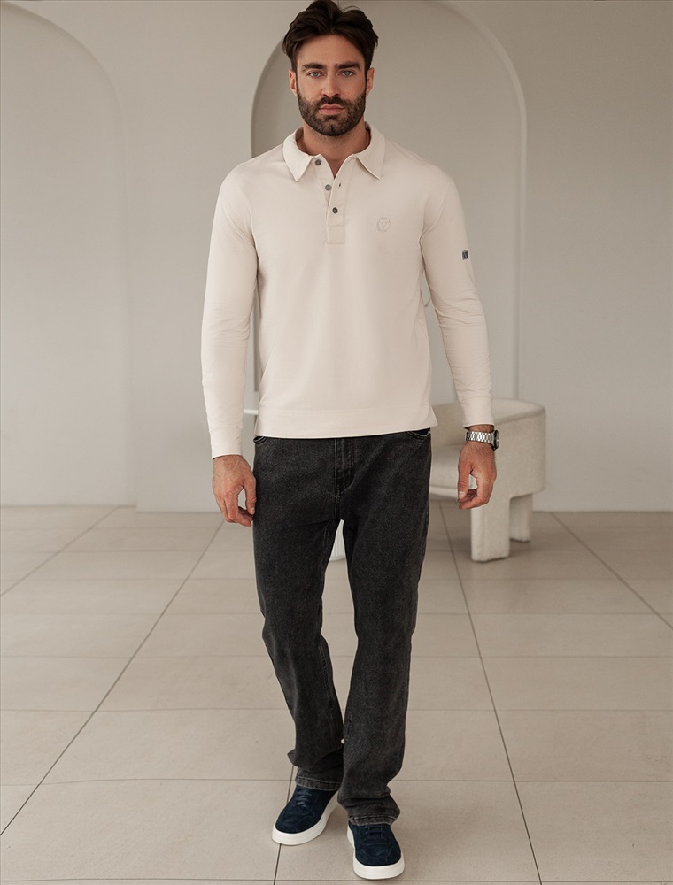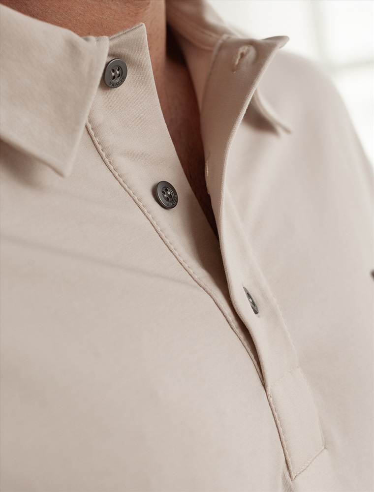 Стильный лонгслив светло-бежевого цвета с воротником поло выполнен из премиального хлопка в сочетании с эластаном . Натуральная ткань обеспечивает легкость, воздухопроницаемость и приятные тактильные ощущения даже когда жарко, позволяет не перегреваться и поддерживает комфортный микроклимат в течение всего дня. Удобный отложной воротник на аккуратных пуговицах делает образ современным и стильным, а длинный рукав защищает руки при ветреной погоде. Поло хорошо садится по фигуре благодаря добавлению эластичных волокон — такой вариант подходит для мужчин любого роста и размеров, не стесняет движений и создает ощущение свободы и легкости.
