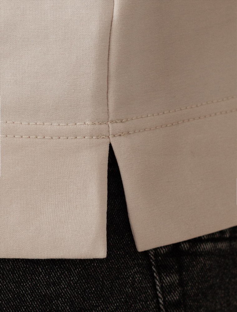 Лонгслив с пуговицами дополнен небольшими разрезами по бокам и ненавязчивой вышивкой в виде надписи в тон основному цвету, которые придают образу индивидуальность, не перегружая его лишними акцентами. Лаконичная вышивка служит оригинальным декоративным элементом, гармонично вписываясь в общий минималистичный облик. Такой подход делает лонг универсальным решением для тех, кто ценит простоту и стремится подчеркнуть свой вкус через детали. Перевод надписи Wanderlust - Страсть к путешествиям.