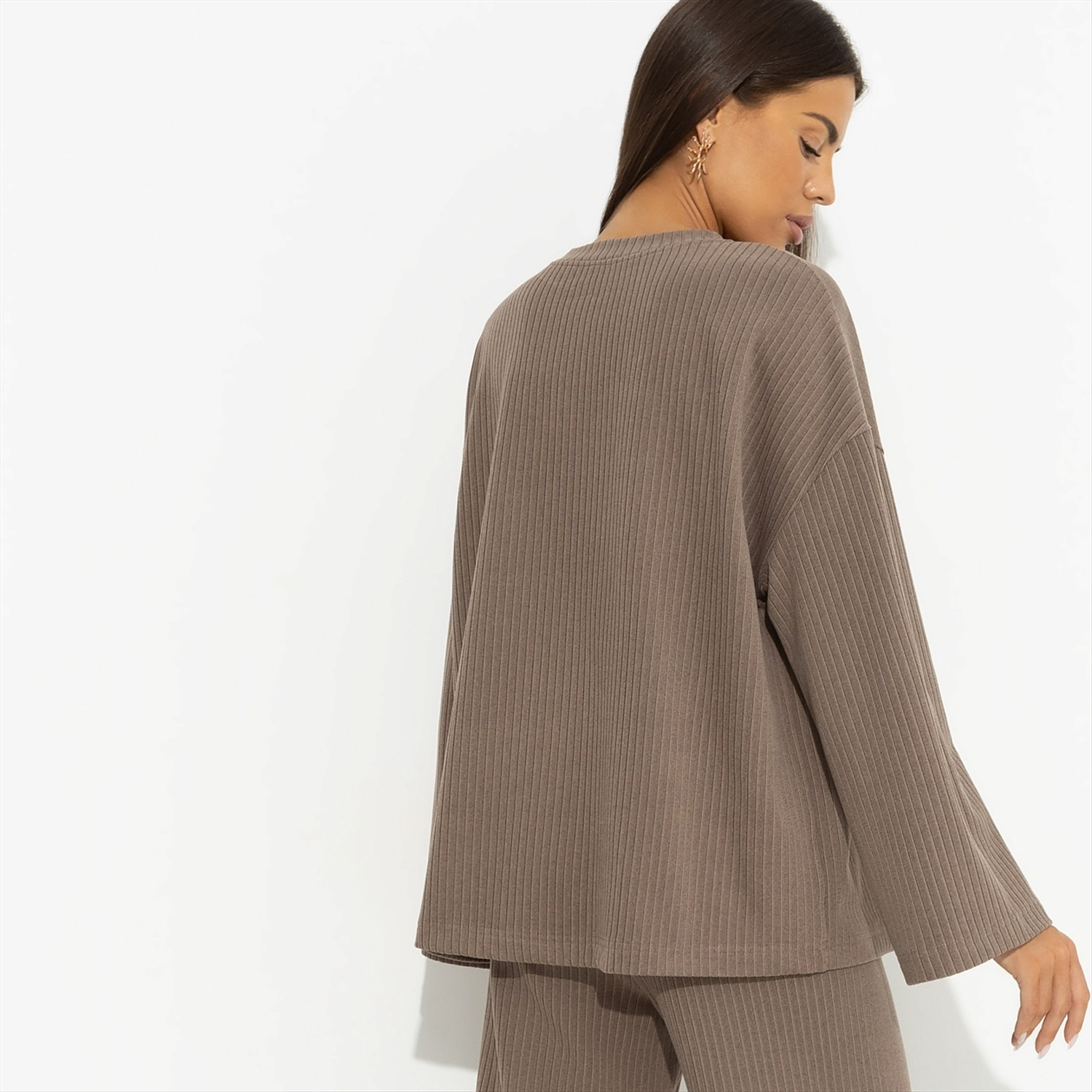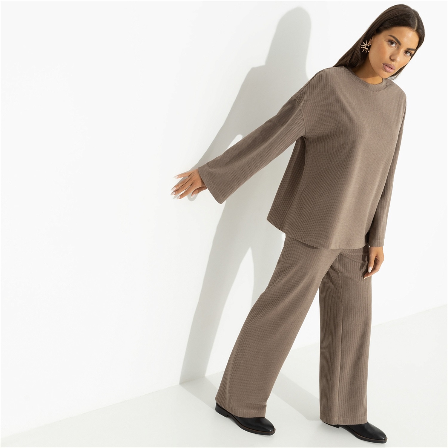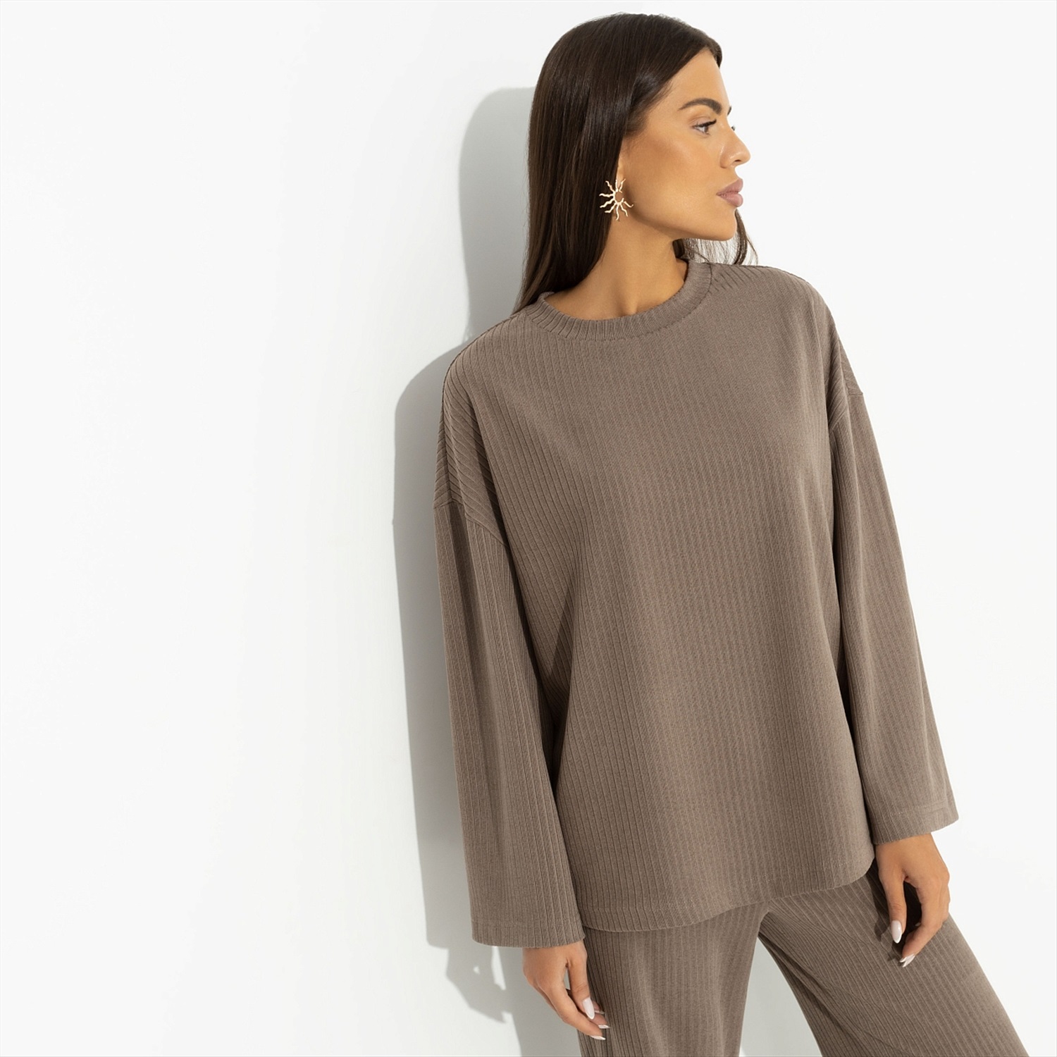 ТН ВЭД: 6106909000; Состав: Трикотаж «лапша-кашемир», «Робин» (40% п/э, 35% вискоза, 20% акрил, 5% спандекс); Плотность ткани: Плотная; Тип ткани: Трикотаж; Вид застежки: Нет; Карманы: Нет; Основной цвет ткани: Коричневый; Отрезная талия: Нет; Подклад: Нет; Резинка по талии: Нет; Рисунок/раппорт: Нет, все изделия идентичны; Сезон: Демисезон; Силуэт: Свободный; Стиль: Повседневный
