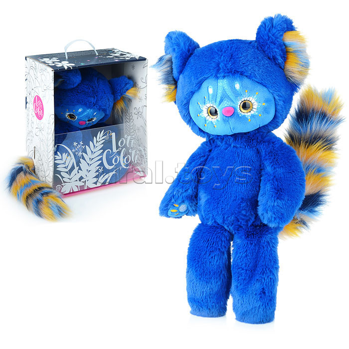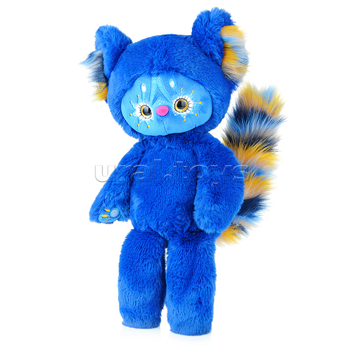 Ярко-синий — днём и тёмно-синий — ночью. Жёлтые полосочки на ушах и хвосте Тоши похожи на золотые солнечные лучи, а глаза-звёздочки словно отражения далеких звезд. Когда Тоши, оттолкнувшись пушистыми лапами от самого высокого дерева, парит в воздухе, солнце, луна и звёзды любуются им. • Высота игрушки (сидя): 30 см. (высота с вытянутыми лапками - 45 см.). • Голова игрушки поворачивается на 360 градусов. • Изготовлено из гипоаллергенных материалов. • Состав: мех искусственный, текстильный материал, элементы из пластмассы. • Набивка: полиэфирное волокно, полиэтиленовые гранулы. • Рекомендуется ручная стирка с мягкими моющими средствами при максимальной температуре 30 градусов. • Товар соответствует требованиям ТР ТС 008/2011 "О безопасности игрушек". • Предназначена для игр детей старше 3 лет.