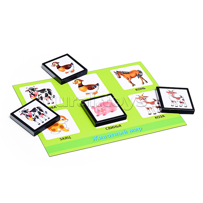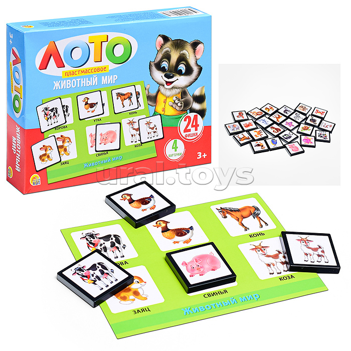 Наличие: >10 В наборе: - 24 фишки - 4 карточки Правила игры: Ведущий раздаёт карточки лото каждому игроку. Затем он берёт по одной пластмассовой фишке и называет вслух то, что на ней изображено. Если картинка на карточке лото у одного из игроков совпадает с изображением на фишке ведущего, то игрок накрывает ею соответствующую область на карточке лото. Первый, у кого закроются все картинки на карточке лото, становится победителем. Материал: картон, пластик. Для детей от 3 лет Соответствует требованиям безопасности продукции. Комментарии к товару
