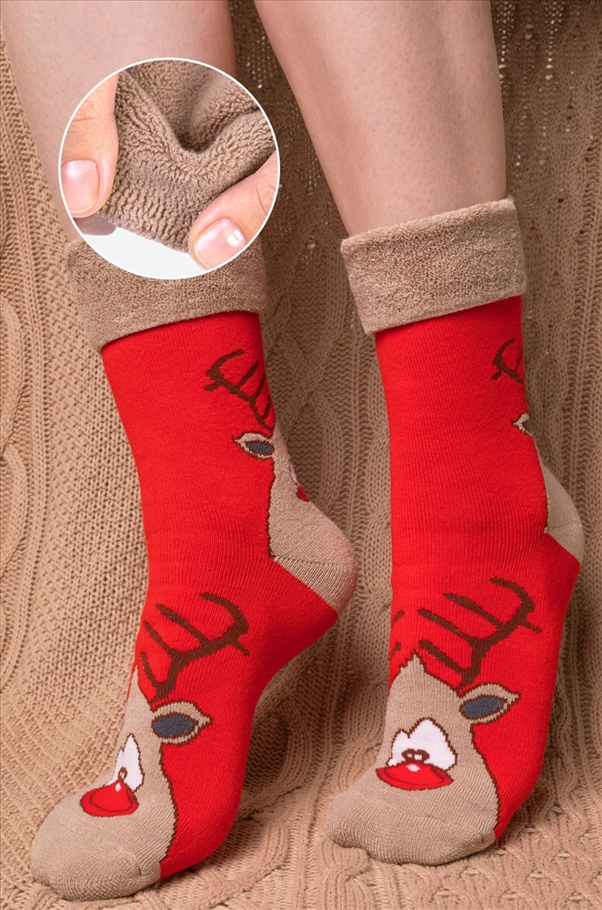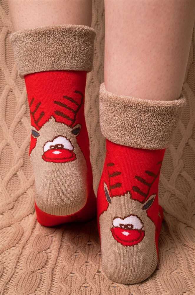 Женские махровые носки с отворотом созданы, чтобы дарить комфорт в прохладные осенние и зимние дни. Теплые носки с новогодним рисунком Олени не просто согреют, но и добавят праздничного настроения.
