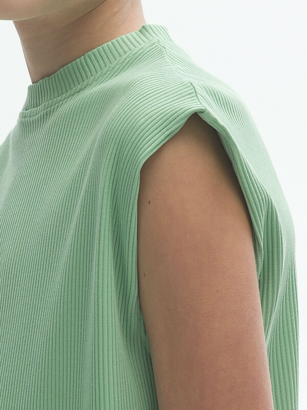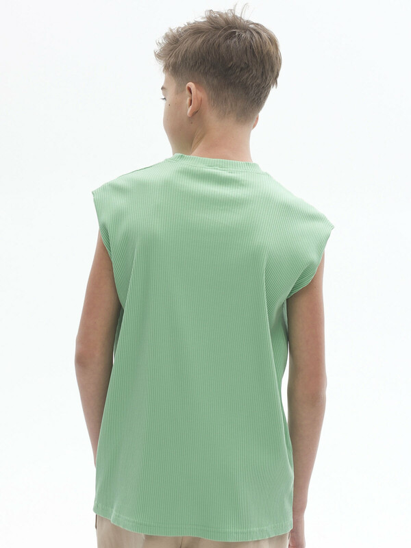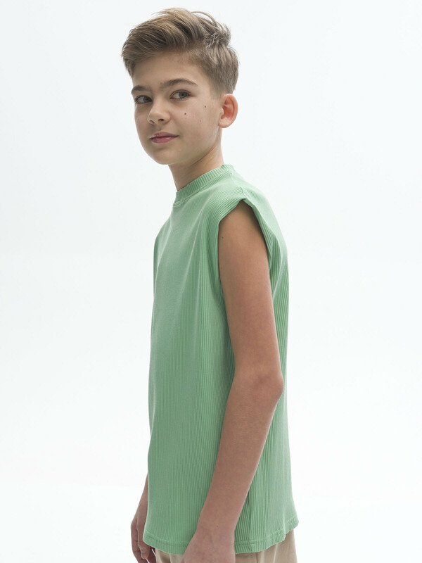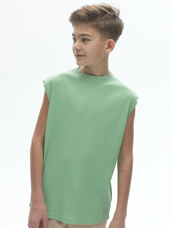 Удлинённая майка из модной ткани в рубчик для мальчика. В составе ткани преобладают хлопок и вискоза — изделие дышит, приятно на ощупь и комфортно для кожи ребёнка. Эластан помогает сохранять форму. Оригинальная обработка проймы: плечо немного удлинено, подогнуто внутрь и закреплено в плечевом и боковом швах — актуальный летний тренд. Майка прямого свободного силуэта не сковывает движений и подойдёт мальчикам с разной фигурой. Отличный выбор для летнего отдыха!