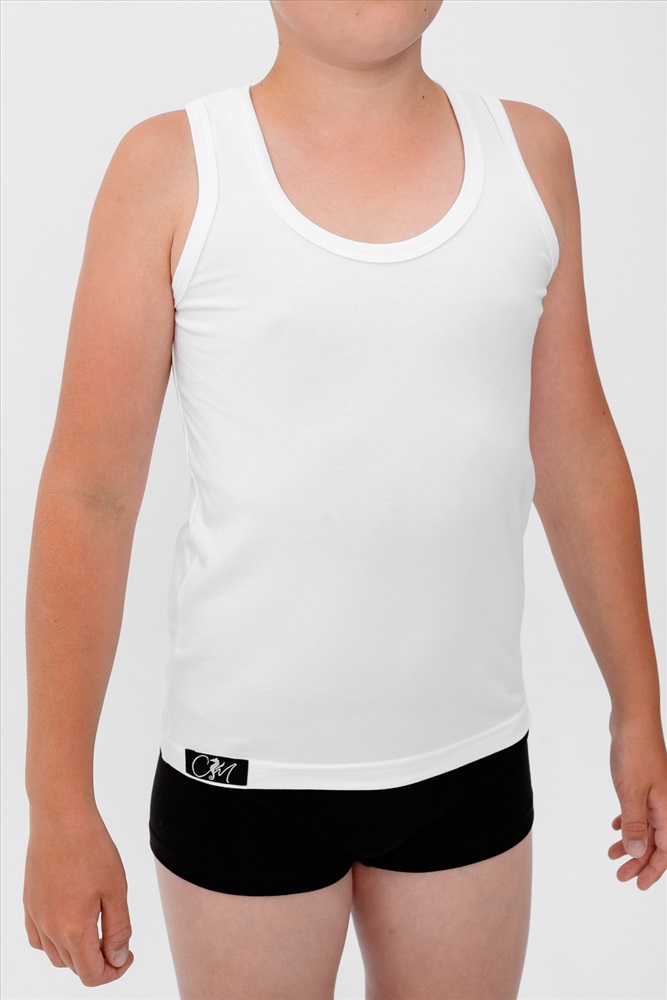 Майка на мальчика изготовлена из мягкого хлопкового трикотажа качества пенье. Майка однотонная полу прилегающего силуэта, длиной до середины линии бедер, с углубленным вырезом горловины и пройм, полочка и спинка майки прямые цельнокроеные.