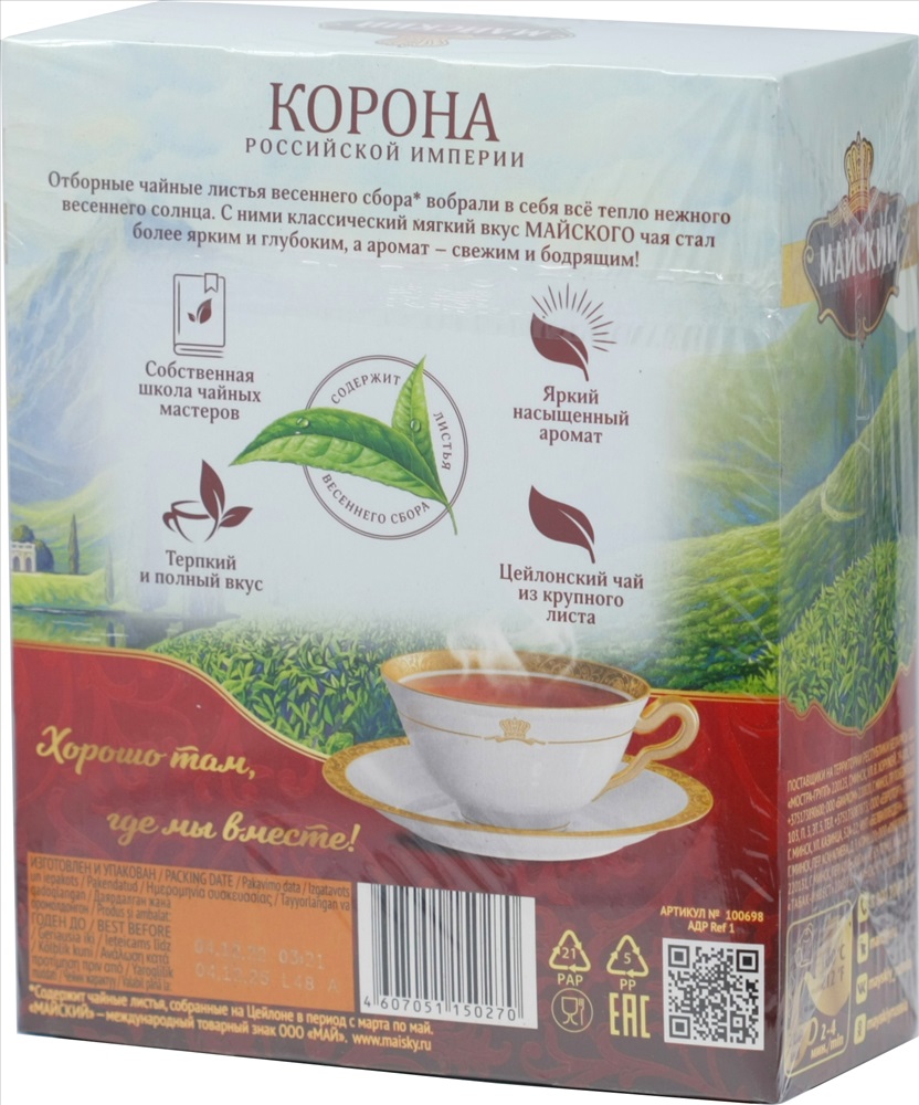 Чай черный байховый в пакетиках с ярлычками.Специально отобранный на Цейлоне крупный чайный лист весеннего сбора и бережная скрутка делают напиток особенно нежным, раскрывая все богатство вкуса и аромата классического черного чая МАЙСКИЙ: терпкий и полный, с ярким насыщенным ароматом и фруктовыми нотами. Обладает золотисто-красноватым цветом настоя. Наслаждайтесь его сбалансированным вкусом каждый день.