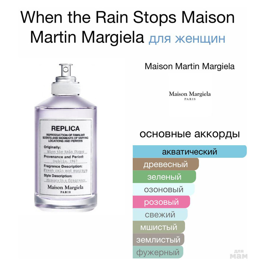 Maison Martin Margiela's When The Rain Stops - прозрачный водяной аромат для женщин, выпущенный в 2021 году. Он пополнил серию Replica. Создала композицию Фанни Бал. Работая над парфюмом, она исследовала окружающую природу и ее явления. В результате свет увидела инновационная композиция,позволяющая осязать, как пахнет окружающий мир после дождя. Парфюмерная вода дарит ни с чем несравнимое чувство радости, когда из туч показываются первые лучи солнца и капли постепенно испаряются, даря свежесть. А умытый мир становится более приветливым и светлым. Яркие зеленые ноты в сочетании со свежим цитрусовым бергамотом дополнены пикантными терпким розовым перцем. Сладкие ноты турецкой пурпурной розы и цветущего белого жасмина сливаются с искристым освежающим бризом акватических аккордов и дождевых капель. Они дарят безмятежность и уверенность в том, что дождь обязательно закончится и всегда наступает хорошая погода. Томные влажные землистые ноты мха и хвойной сосны в синергии с чувственным пачули. В результате образуется динамичный и запоминающийся шлейф, дарящий радость и положительные эмоции. Экологически ответственный бренд Maison Martin Margiela's для создания аромата When The Rain Stops используете только проверенные ингредиенты, органические, произрастающие в местах естественного обитания, соответствующие наивысшим этическим и экологическим стандартам.