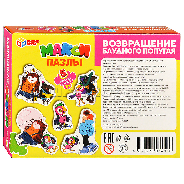 • В наборе 5 больших пазлов. • Материал: картон. • Соответствует требованиям безопасности продукции. • Для детей от 3 лет.