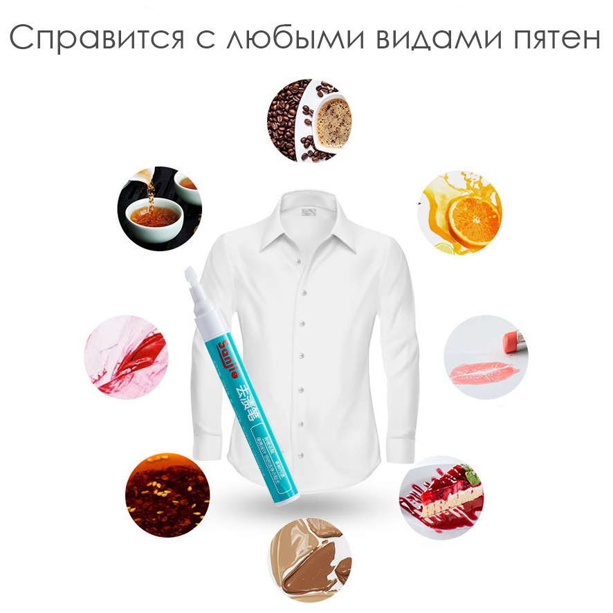 Маркер-пятновыводитель легко удаляет свежие пятна от кофе,чая, красного вина, сока, йогурта, соуса, детского питания и даже косметики.