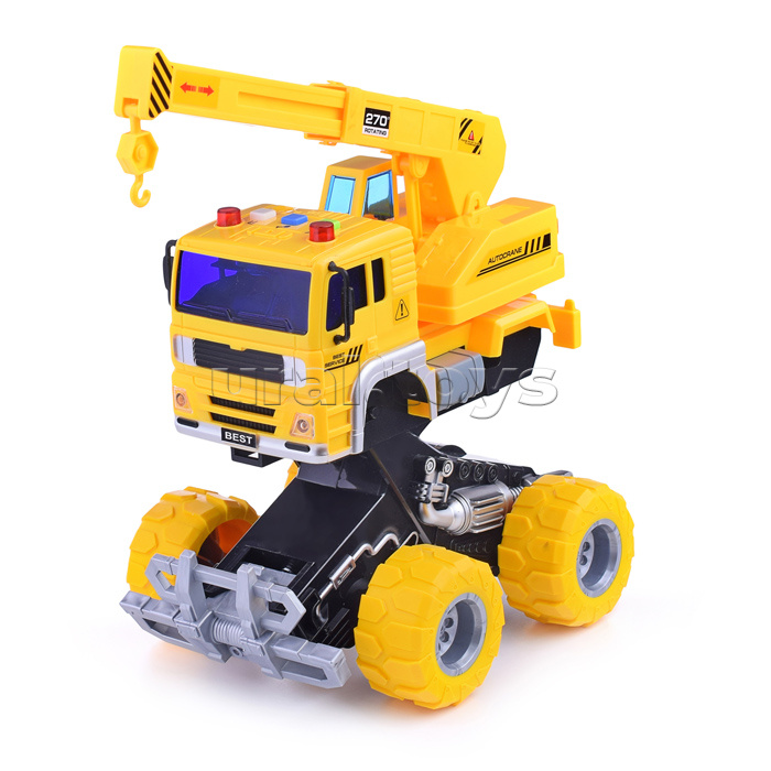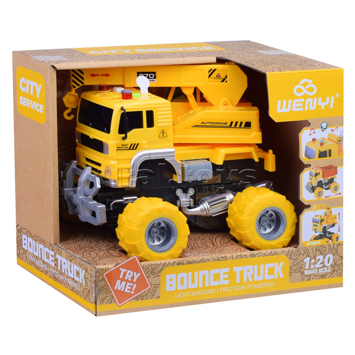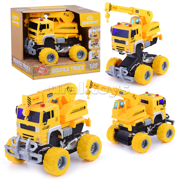 Наличие: >10 • Размеры машины: 20х14.5х19 см. • Инерционный механизм движения. • Подвижная башня крана. • При нажатии кнопок на крыше: звук мотора, клаксон, звук заднего хода, мигание ламп. • Свет и звук работают от 3-х батареек "AG13" (входят в комплект для демонстрации) • Материал: пластик. • Резиновые покрышки. • Соответствует требованиям безопасности продукции. • Для детей от 3-х лет. Комментарии к товару