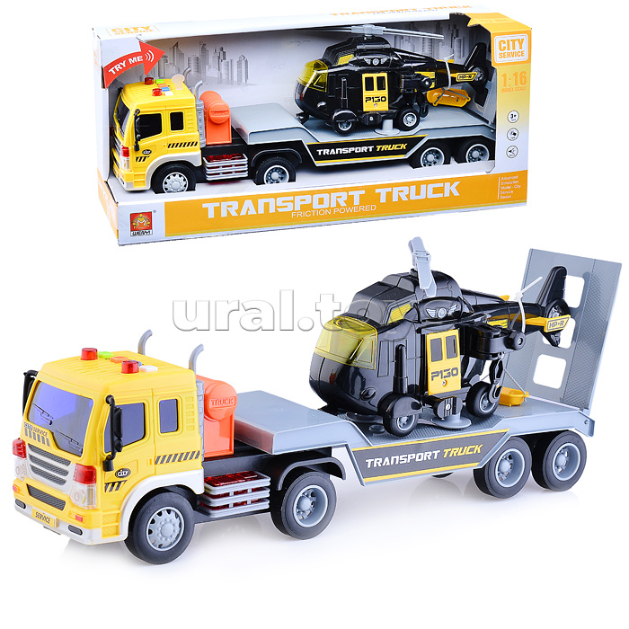 Наличие: >10 • В наборе: - автовоз с инерционным механизмом (40х9.5х13 см.) - вертолёт (21х7х11 см.) • 4 кнопки на крыше автовоза (звук мотора, клаксон, задний ход, мигание лампочек) • Свет и звук работают от 3-х батареек "AG13" (входят в комплект) • При нажатии рычага на вертолёте, вращается пропеллер. • Материал: пластик. • Соответствует требованиям безопасности продукции. • Для детей от 3-х лет. Комментарии к товару