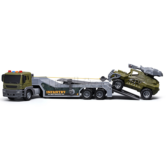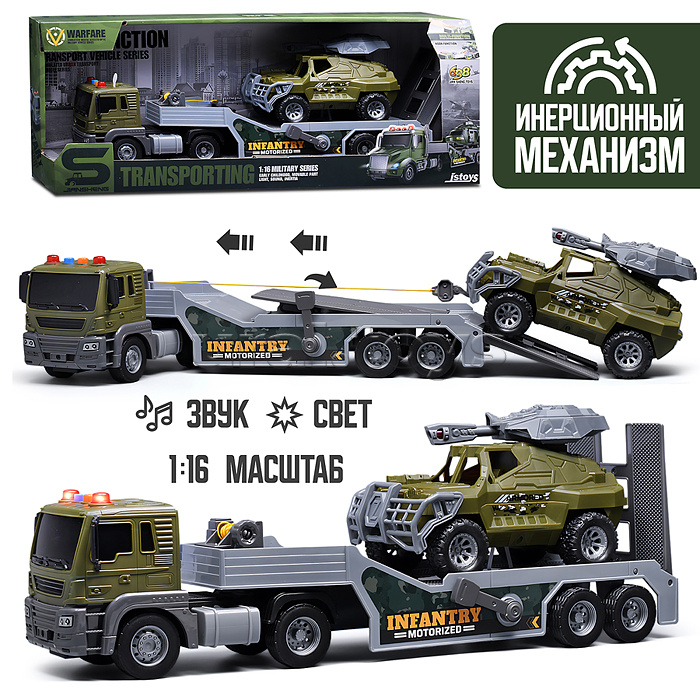 • Функции автовоза: - инерционный механизм движения. - разматывающаяся лебёдка. - поднимающаяся платформа прицепа. - звук мотора. - звук работы. - звуковой сигнал. - мигание ламп. • Свет и звук работают от 3-х батареек "AG13" (входят в комплект для демонстрации) • В комплекте джип с инерционным механизмом (18х9х11 см.) • Материал: пластик. • Соответствует требованиям безопасности продукции. • Для детей от 3-х лет. Комментарии к товару