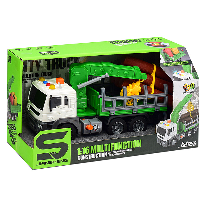 • Функции машины: - инерционный механизм движения. - пневматический механизм поднятия и опускания стрелы с крюком. - выдвижной крюк. - откидывающийся кузов. - открывающиеся борта кузова. - звук запуска и работы мотора. - звук клаксона. - звук работы. - сигнал заднего хода. - мигание проблесковых маячков. • Свет и звук работают от 3-х батареек "AG13" (входят в комплект для демонстрации). • Материал: пластик. • Соответствует требованиям безопасности продукции. • Для детей от 3-х лет. Комментарии к товару