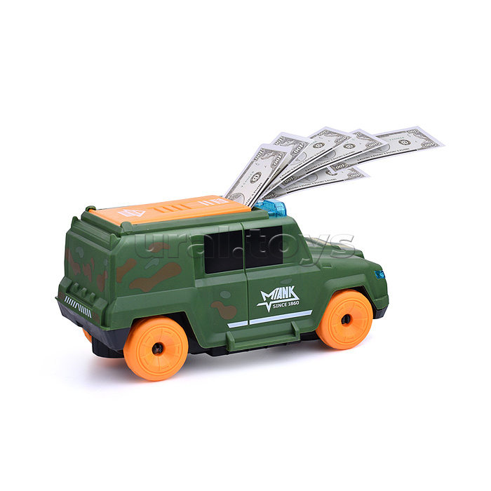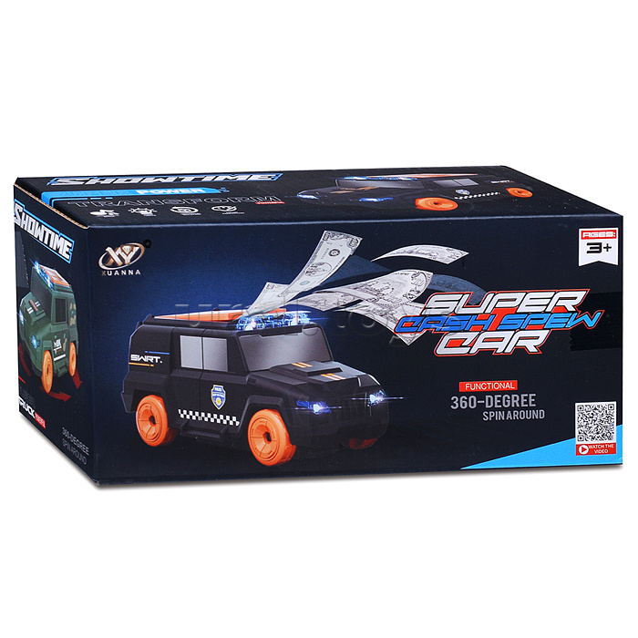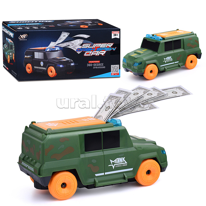 Наличие: >10 • Размеры игрушки: 20х10х10 см. • Функции: - движение по кругу. - весёлая мелодия. - звук сирены. - свет проблесковых маячков. - метание купюр (20 шт. в комплекте). • Для работы нужны 4 батарейки "АА" (не входят в комплект). • Материал: пластик. • Соответствует требованиям безопасности продукции. • Для детей от 3-х лет. Комментарии к товару