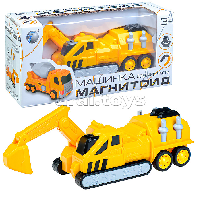 Наличие: >10 Размеры игрушки ДхШхВ: 19х6.5х9 см. Особенности: - машинка магнитоид состоит из 3-х частей, соединяющихся между собой специальным креплением и магнитом; - на колёсах резиновые покрышки; - ковш и стрела подвижные; - инерционный механизм движения. Материал: пластик, элементы из металла. Соответствует требованиям безопасности продукции. Для детей старше 3 лет. Комментарии к товару