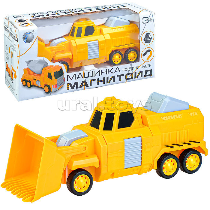 Наличие: >10 Размеры игрушки ДхШхВ: 21х6.3х8 см. Особенности: - машинка магнитоид состоит из 3-х частей, соединяющихся между собой (магнитики входят в комплект); - резиновые покрышки; - ковш можно поднимать и опускать; - инерционный механизм движения. Материал: пластик, элементы из металла. Соответствует требованиям безопасности продукции. Для детей старше 3 лет. Комментарии к товару