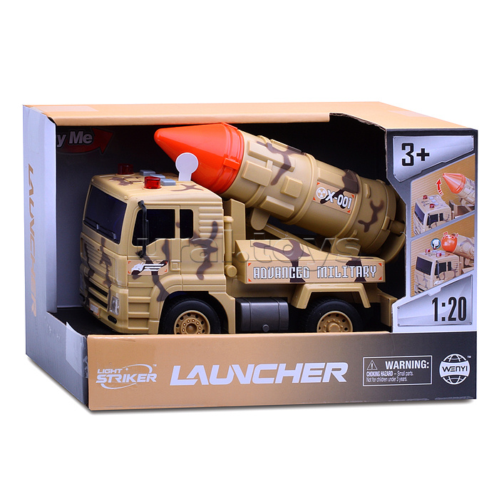 Наличие: >10 • Размеры игрушки: 19х8х13 см. • Масштаб: 1/20. • Инерционный механизм движения. • Ракета поднимается и опускается (вручную) • 3 звуковые кнопки на крыше (звук работы, гудок, звук заднего хода) • При нажатии на кнопки горят фонари. • Свет и звук работают от 3-х батареек "AG13" (входят в комплект для демонстрации) • Материал: пластик. • Колёса с резиновыми покрышками. • Соответствует требованиям безопасности и качества продукции. • Для детей от 3-х лет. Комментарии к товару