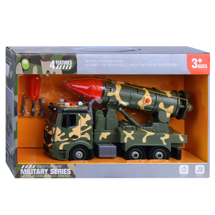 Наличие: >10 • Размеры игрушки: 28х9х17 см. • Инерционный механизм движения. • Машину можно разбирать выкручивая поастиковые болты и гайки (16 деталей) • Пластиковая отвёртка в комплекте. • Ракетная установка, с пружинным механизмом, стреляет пластиковым снарядом. • Ракетная установка поворачивается на 360 градусов. • Звуковой модуль на крыше: мелодия, 3 забавных звука, сигнал клаксона, мигание лампочек. • Свет и звук работают от 3- батареек "LR44" (входят в комплект для демонстрации) • Материал: пластик. • Соответствует требованиям безопасности продукции. • Возраст: от 3-х лет. Комментарии к товару