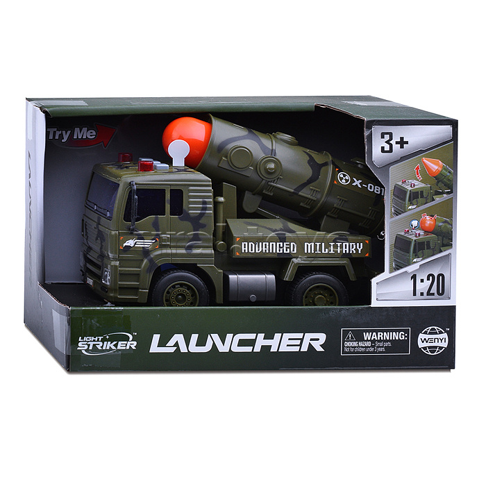 Наличие: >10 • Размеры игрушки: 19х8х13 см. • Масштаб: 1/20. • Инерционный механизм движения. • Ракета поднимается и опускается (вручную) • 3 звуковые кнопки на крыше (звук работы, гудок, звук заднего хода) • При нажатии на кнопки горят фонари. • Свет и звук работают от 3-х батареек "AG13" (входят в комплект для демонстрации) • Материал: пластик. • Колёса с резиновыми покрышками. • Соответствует требованиям безопасности и качества продукции. • Для детей от 3-х лет. Комментарии к товару